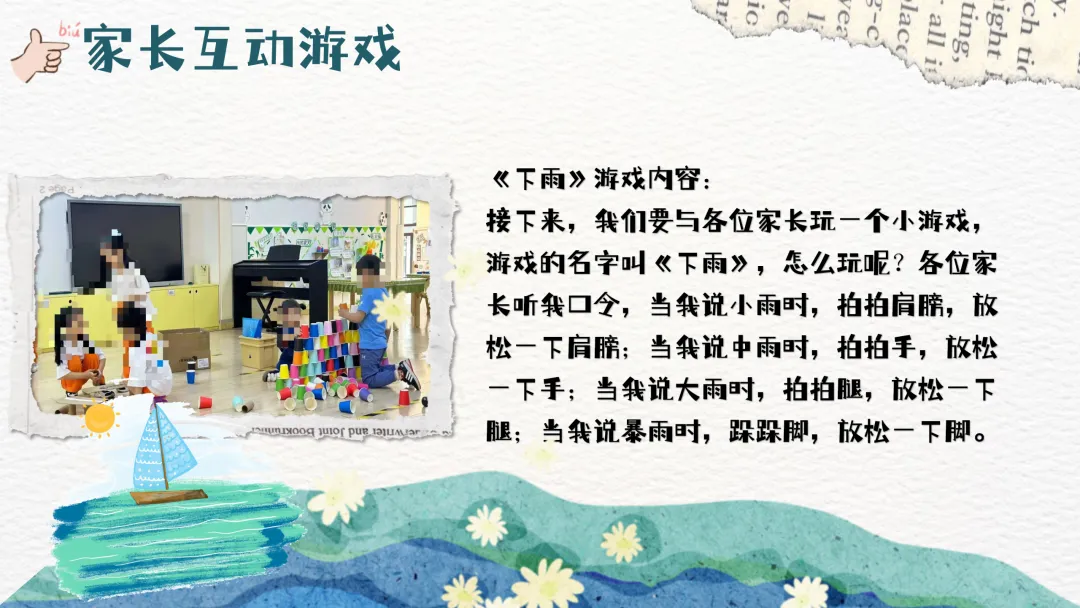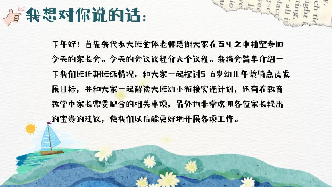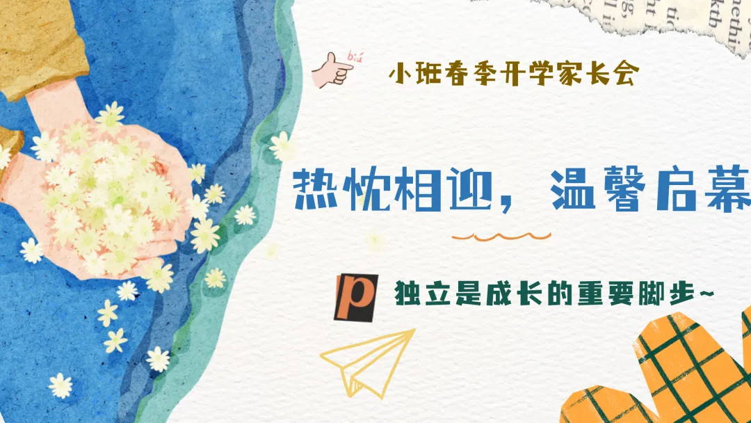 我们这次的体验式家长会会分6个环节来进行,希望各位家长都能够积极参与进来,开始是首先是一个热身游戏,然后是召开家长会与孩子入园的意义和班级情况分析,接着我们会详细地和各位家长分析介绍幼儿园小班上学期的一日活动安排、主要课程和重要活动,第五部分是我们的一个话题讨论,最后是我们家长需要配合的一些要点。