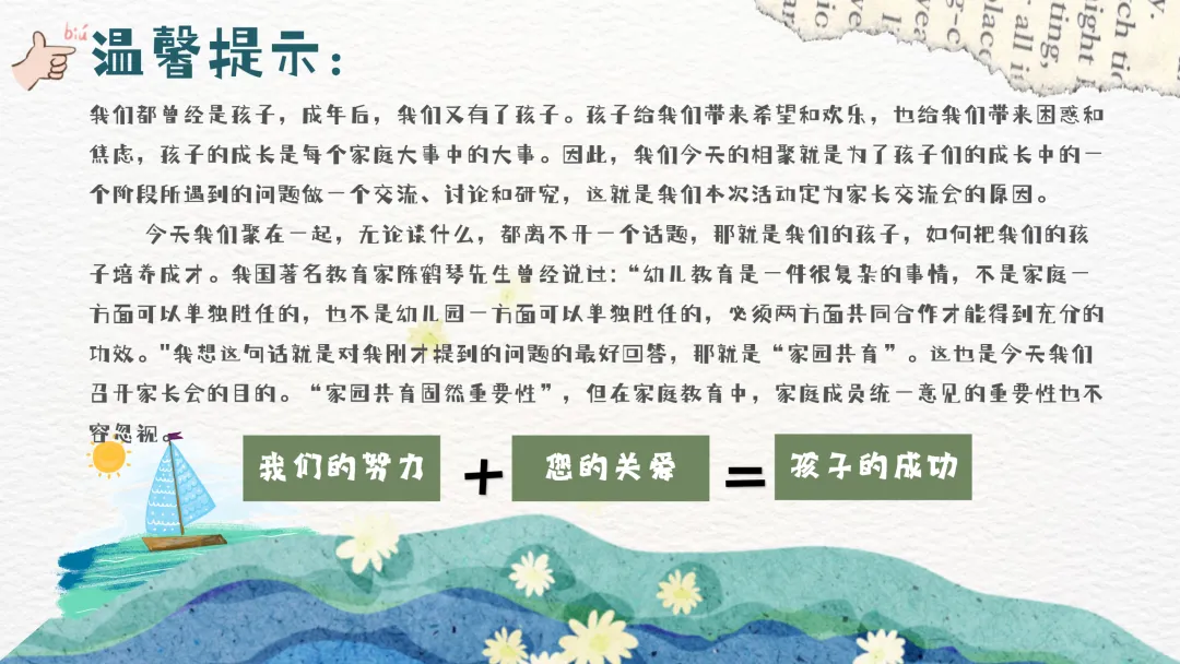 今天我们聚在一起,无论谈什么,都离不开一个话题,那就是我们的孩子,如何把我们的孩子培养成才。我国著名教育家陈鹤琴先生曾经说过:“幼儿教育是一件很复杂的事情,不是家庭一方面可以单独胜任的,也不是幼儿园一方面可以单独胜任的,必须两方面共同合作才能得到充分的功效。"我想这句话就是对我刚才提到的问题的最好回答,那就是“家园共育”。这也是今天我们召开家长会的目的。“家园共育固然重要性”,但在家庭教育中,家庭成员统一意见的重要性也不容忽视。