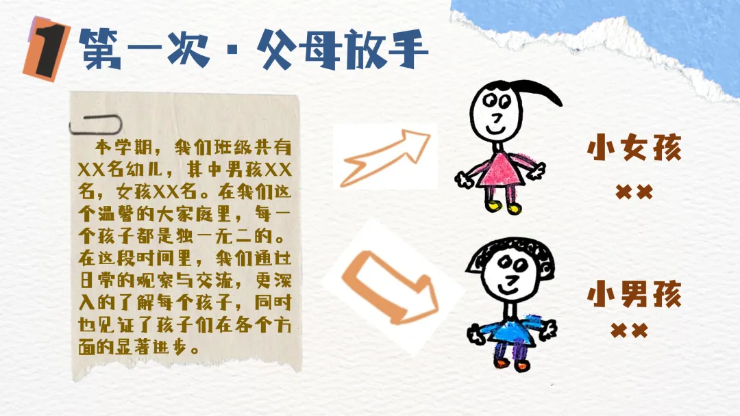 本学期我们班共有XX名小朋友,其中女生XX名,男生XX名,新插班幼儿2名,男女比例较均衡。在本学期里,因您们的支持配合,经过大家的共同努力,孩子们在各方面有了很大的进步。