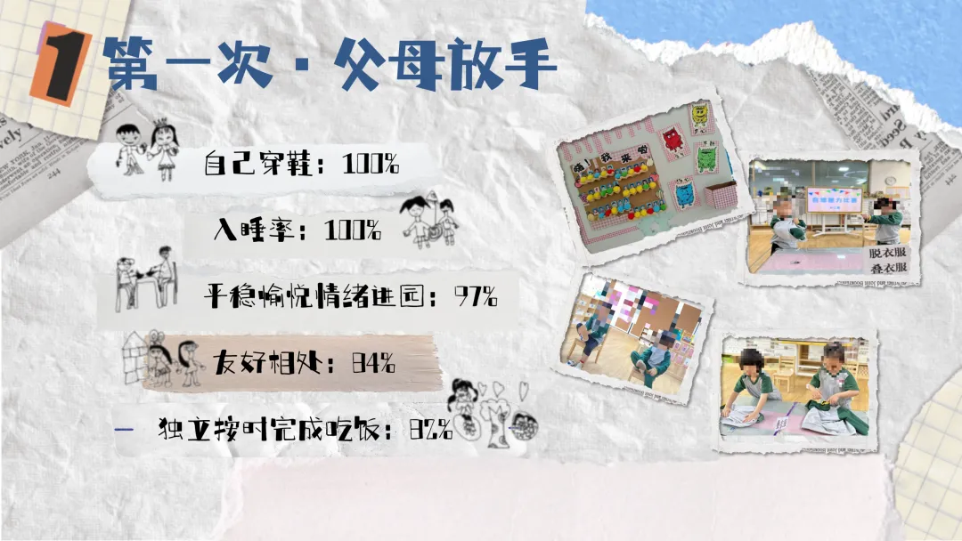 我们孩子自己穿鞋:100%,入睡率:100%、友好相处:84%、平稳愉悦情绪进园:97%、独立按时完成吃饭:82%
