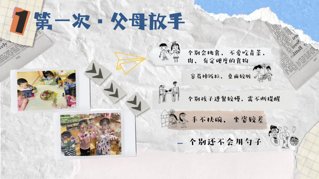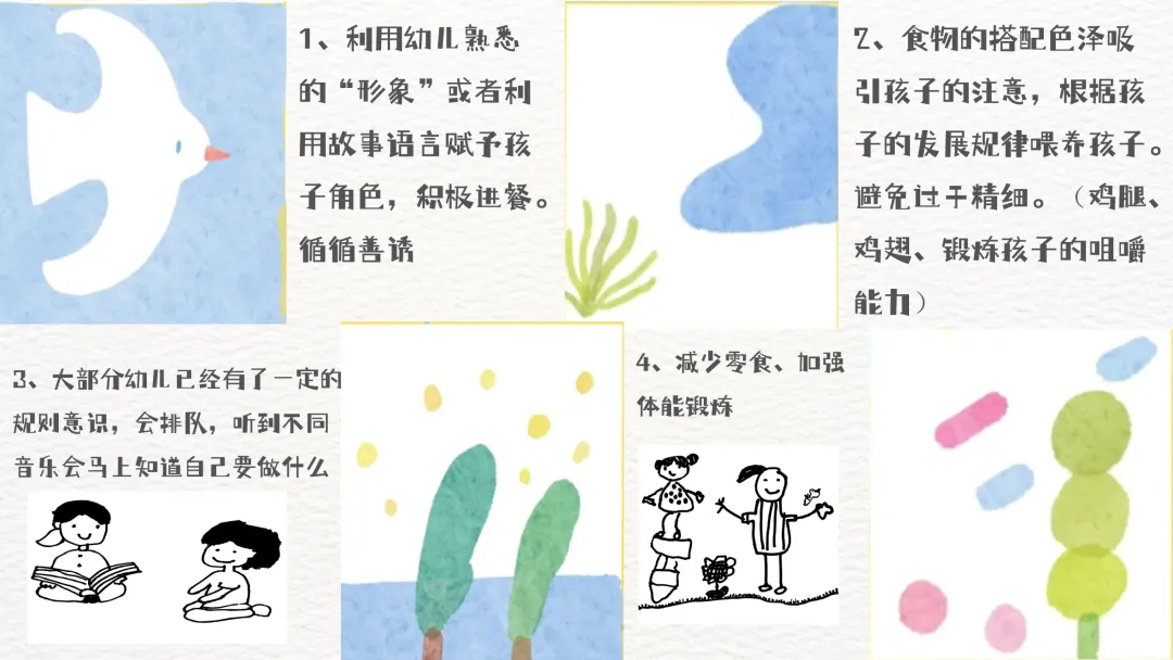 1、利用幼儿熟悉的“形象”或者利用故事语言赋予孩子角色,积极进餐。循循善诱