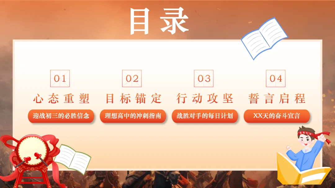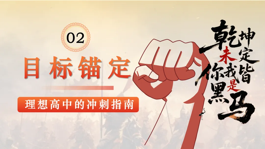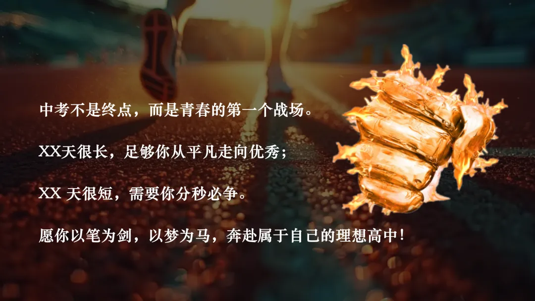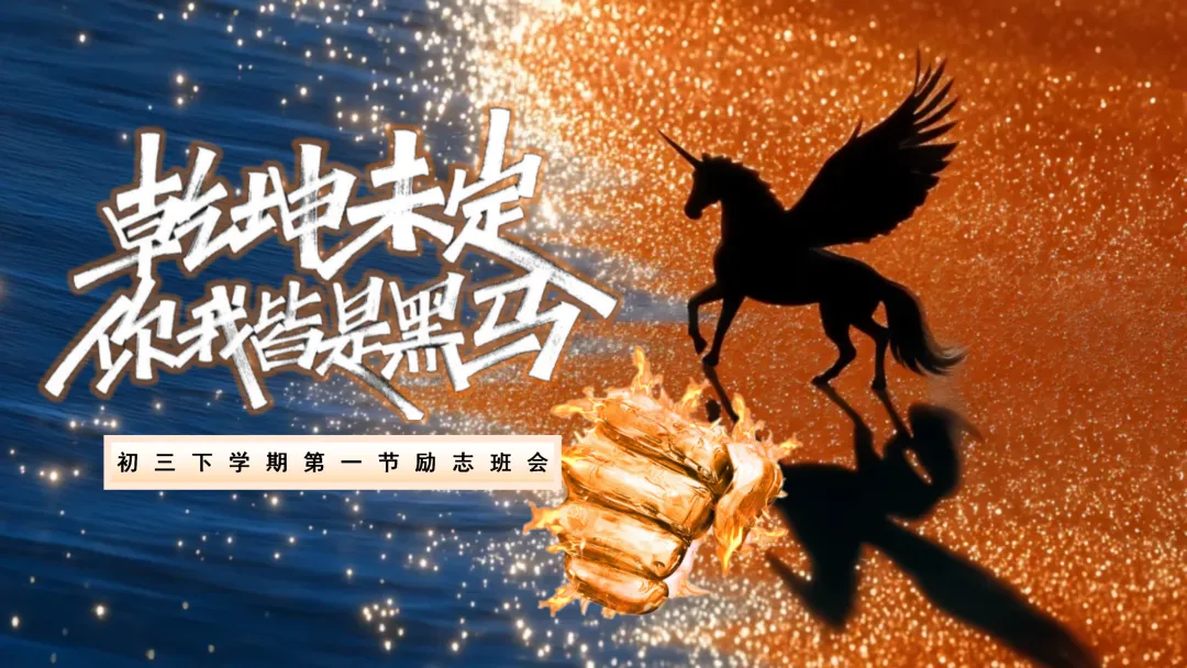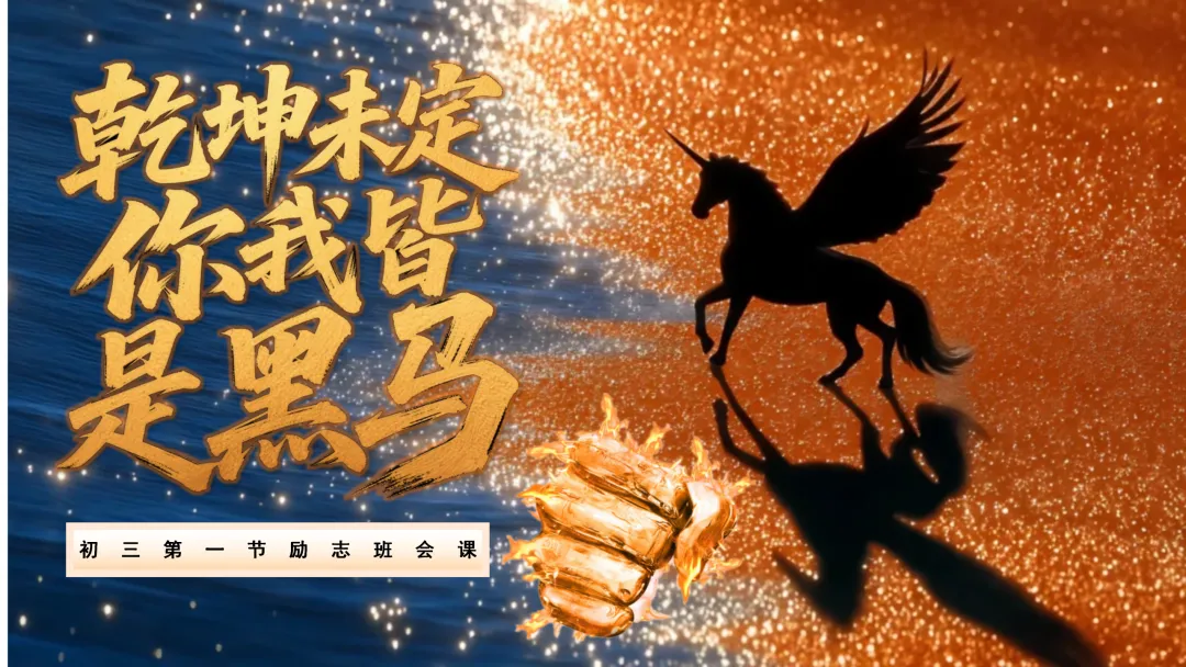 老师:请大家看屏幕上的主题“乾坤未定,你我皆是黑马”。这句话告诉我们,在中考这场战役结束之前,没有人可以预知最终的结果。每个人都有机会通过自己的努力,实现逆袭,成为那匹令人瞩目的黑马。无论你过去的成绩如何,从今天起,一切皆有可能。