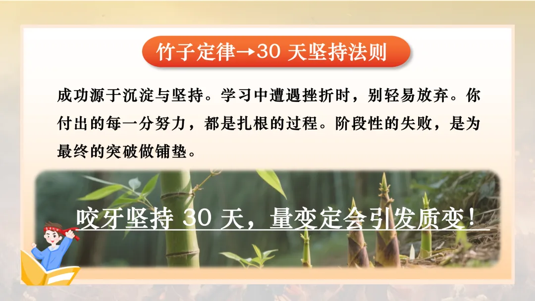 惑。但请大家记住,你付出的每一分努力,都是扎根的过程。阶段性的失败,是为最终的突破做铺垫。只要我们咬牙坚持30天,量变定会引发质变。