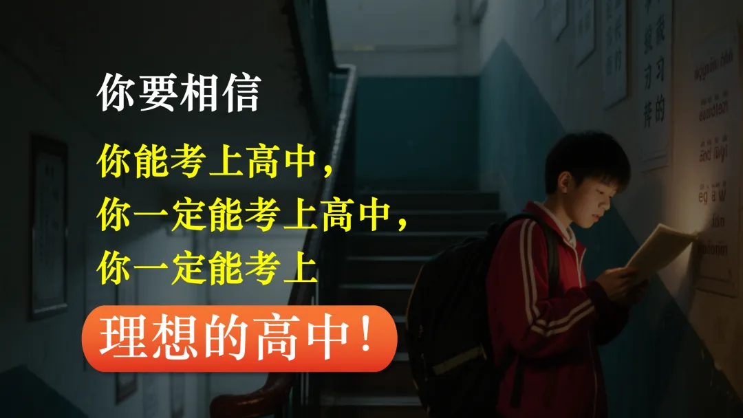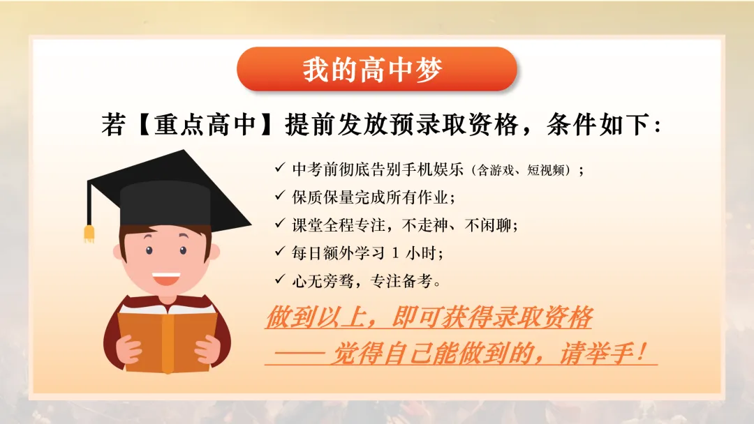 老师:同学们,现实数据告诉我们,重点高中的录取率约15%,普高的录取率约50%。无论你的目标高低,属于你的那张录取通知书,正在向你奔赴而来。只要你努力,就有机会实现自己的高中梦。
