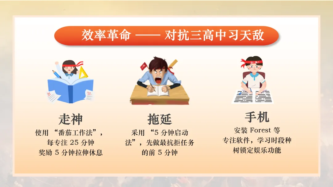 老师:在学习过程中,我们会遇到三个天敌:走神、拖延和手机。我们要学会对抗这三个天敌,提高学习效率。