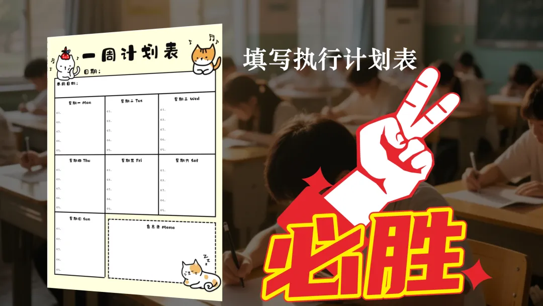 老师:请大家填写执行计划表,将自己的每日、每周、每月的学习任务细化到每一个时间段。这样,我们就能清楚地知道自己每天需要做什么,避免盲目学习。