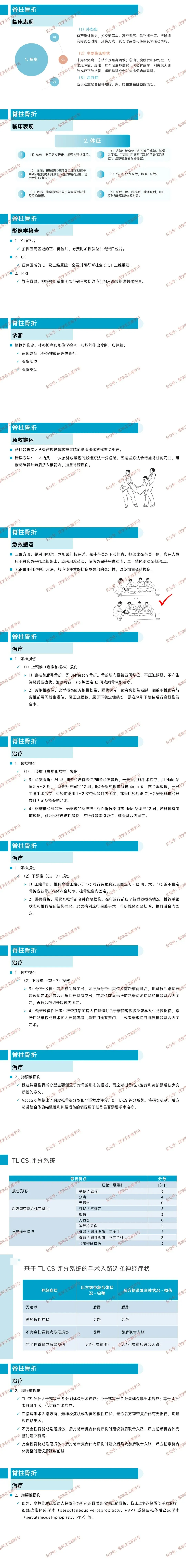 治疗核心:根据骨折类型、稳定性及神经损伤情况选择保守或手术,胸腰椎损伤可参考 TLICS 评分决策。