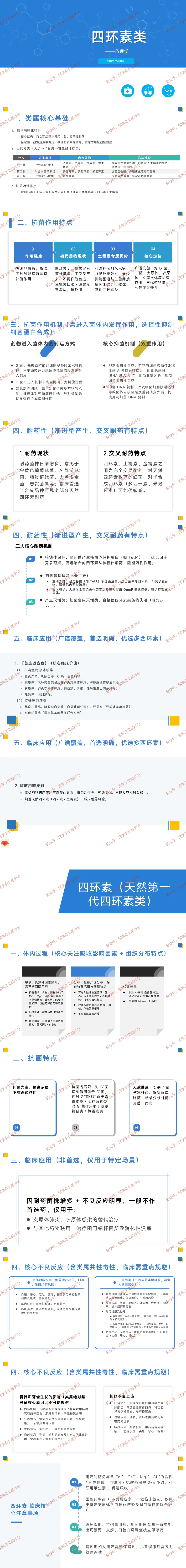 抗菌定位:广谱抑菌药,高浓度时杀菌;对 G⁺菌、G⁻菌、支原体、衣原体、立克次体等均有效,三代药物抗耐药性显著。