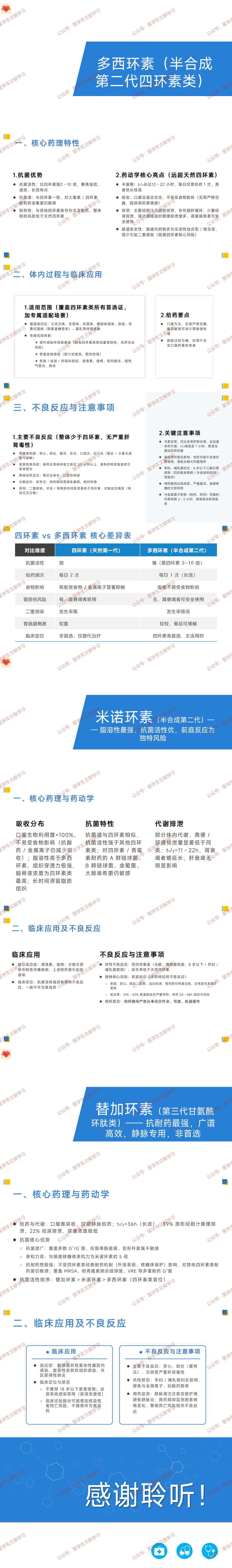 给药要点:多西环素餐后服用减少刺激,服药后保持直立体位 30 分钟;替加环素仅静脉滴注,警惕静脉炎。