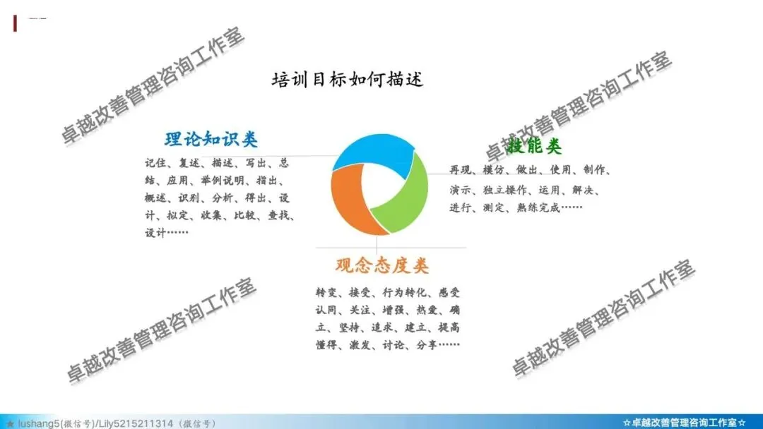 · 例如:培训结束后,学员(A)在不借助外部资料的情况下(C),能独立操作XX设备(B),准确率达到95%(D)。