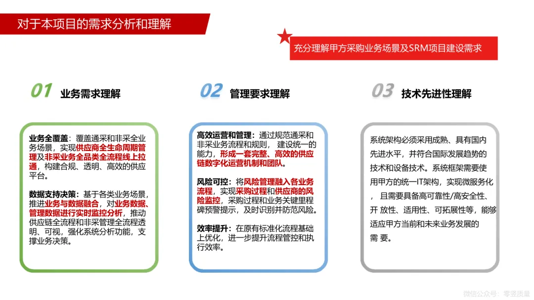 准确把握甲方业务需求,涵盖通采与非采全业务场景线上拉通、供应商全生命周期管理;管理需求聚焦高效运营、风险可控、效率提升;技术需求明确系统需采用统一 IT 架构,实现微服务化,具备高可靠、高安全等特性。