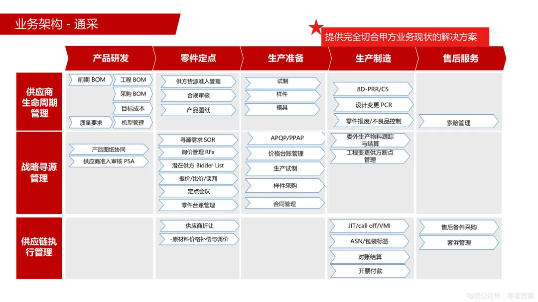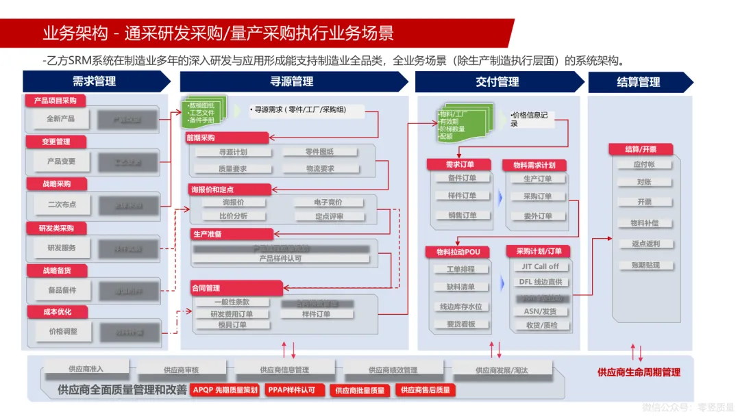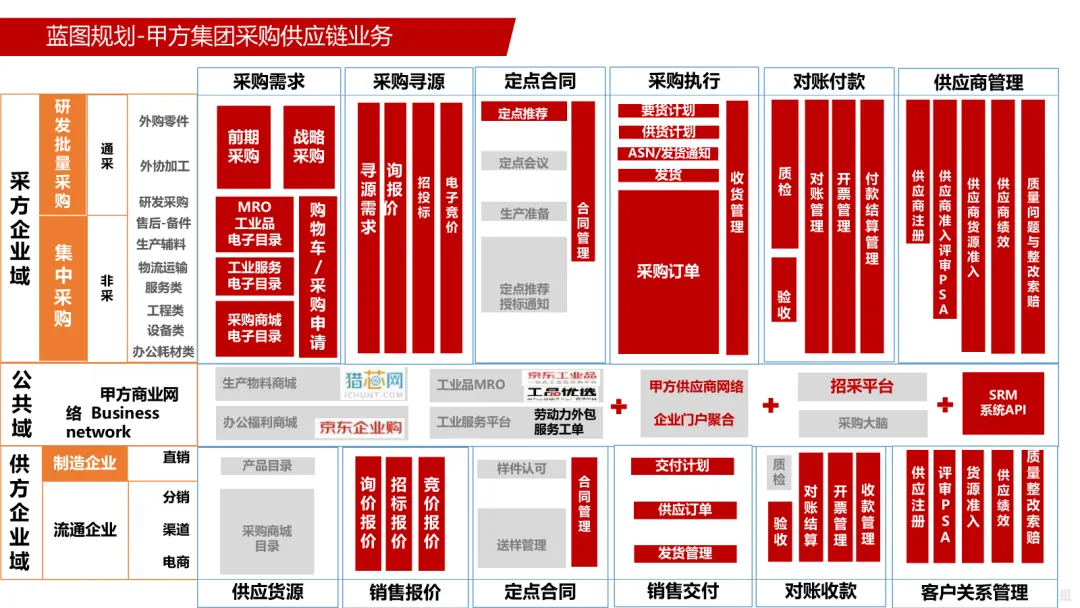 明确甲方集团采购供应链业务框架,覆盖从供应商准入、寻源、采购执行到结算的全链条,规划了通采与非采两大板块的业务架构与实施路径。