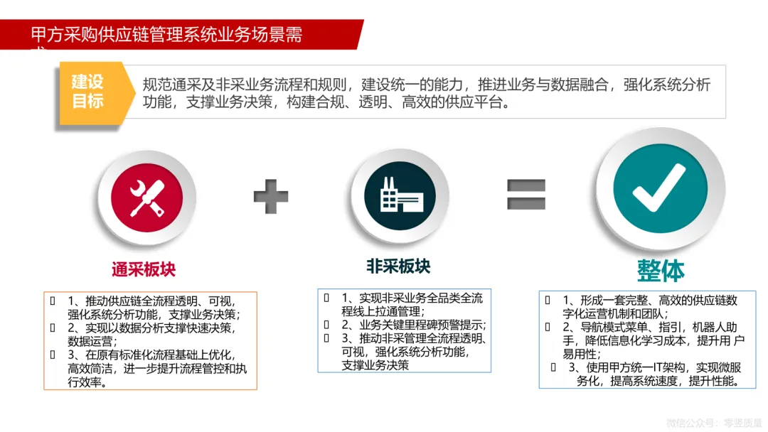 甲方采购供应链面临需求响应、风险应对、供应应变等挑战。建设目标包括:通采与非采业务流程规范,供应链全流程透明可视;数据支撑决策,实现数据运营;构建高效数字化运营机制,降低信息化学习成本,提升系统性能。