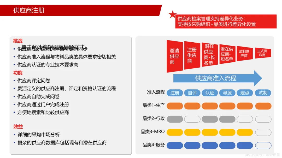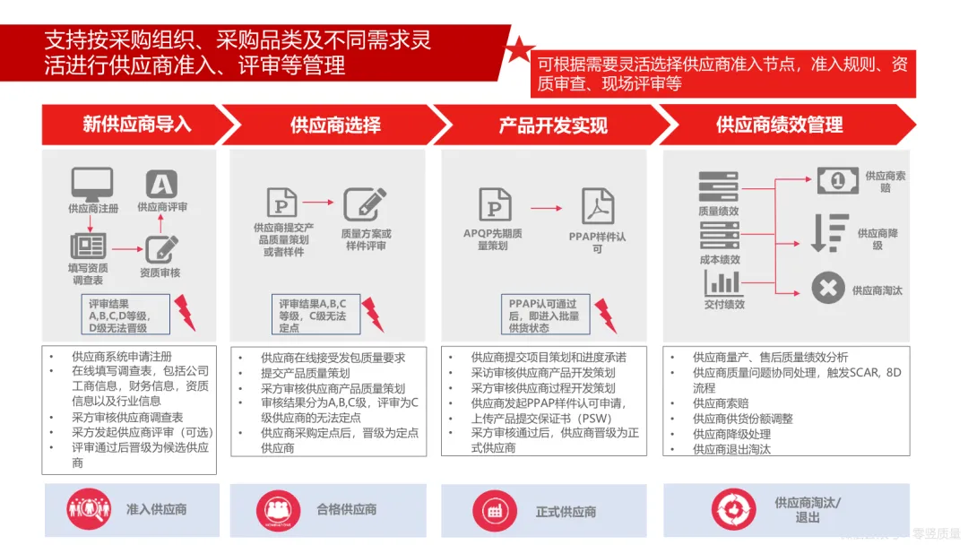 供应商管理闭环:覆盖注册、准入、质量管理、绩效评估到发展 / 淘汰的全生命周期,实现科学分级与动态管控。