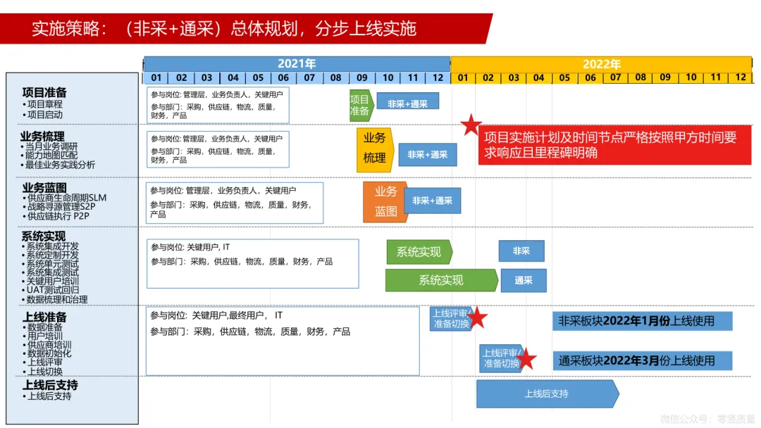 采用 “总体规划,分步上线” 策略,分为项目准备、业务梳理、蓝图设计、系统实现、上线准备及上线后支持等阶段,明确通采与非采板块的上线时间节点。