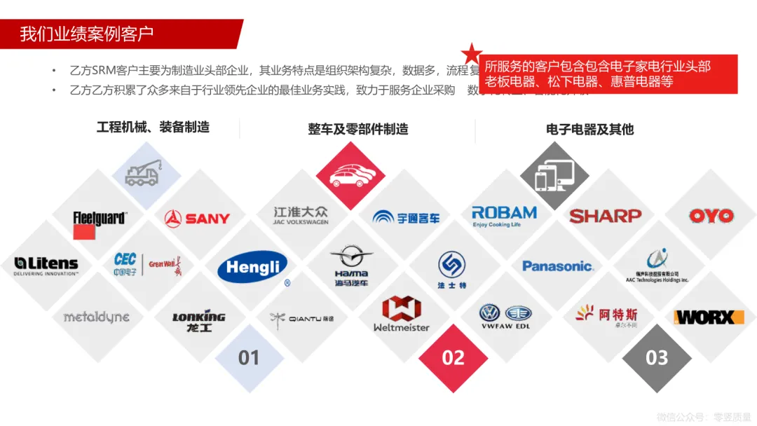 服务众多制造业头部企业,涵盖工程机械、装备制造、电子电器等多个领域,项目类型包括 SRM 平台建设、采购数字化平台等,积累了丰富的行业最佳实践。