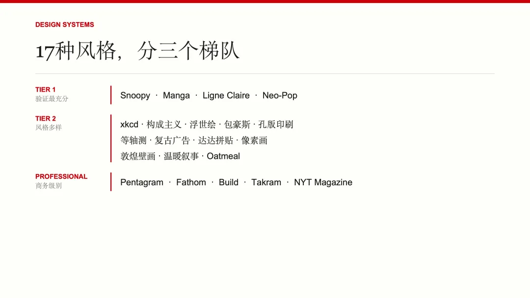 然后是风格。现在内置了17种设计风格,从Snoopy漫画、浮世绘、敦煌壁画这种艺术感强的,到纽约时报杂志风、麦肯锡风这种商务感强的,都有。AI会根据你的主题自动推荐三个最合适的,你选一个就行。