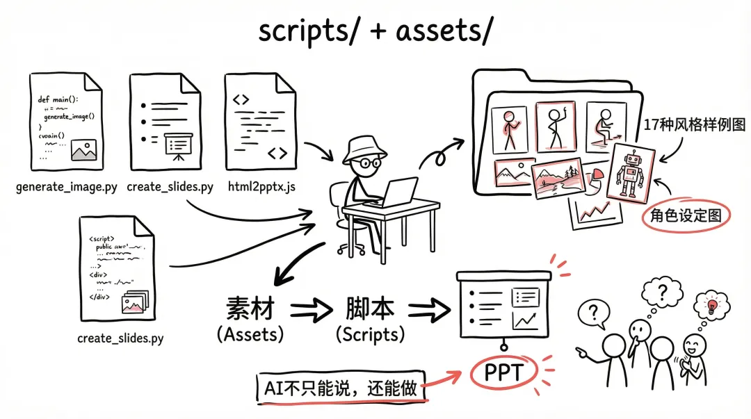 最后看看有没有可以脚本化的动作。把HTML转PPT、调用API生成图片、上传图片到图床——这些确定性的操作,写成脚本放在scripts里,AI就能直接执行,而不是告诉你「你应该怎么做」。