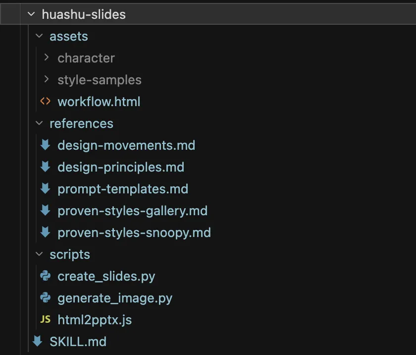 scripts/——执行脚本,3个。一个是generate_image.py,调用Gemini API生成图片;一个是html2pptx.js,把HTML页面转成可编辑的PPTX;还有一个create_slides.py,把图片拼成全屏PPTX。