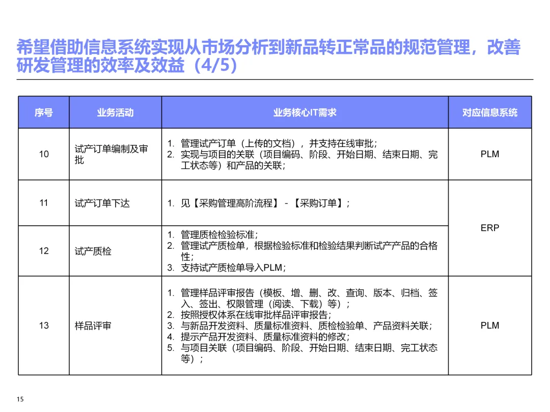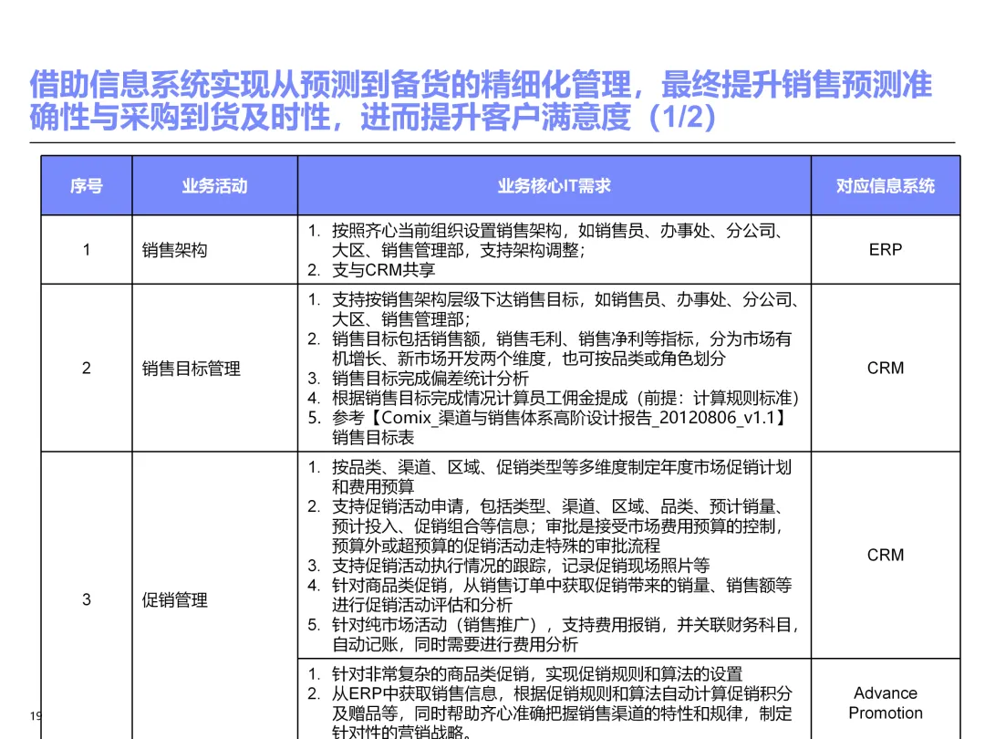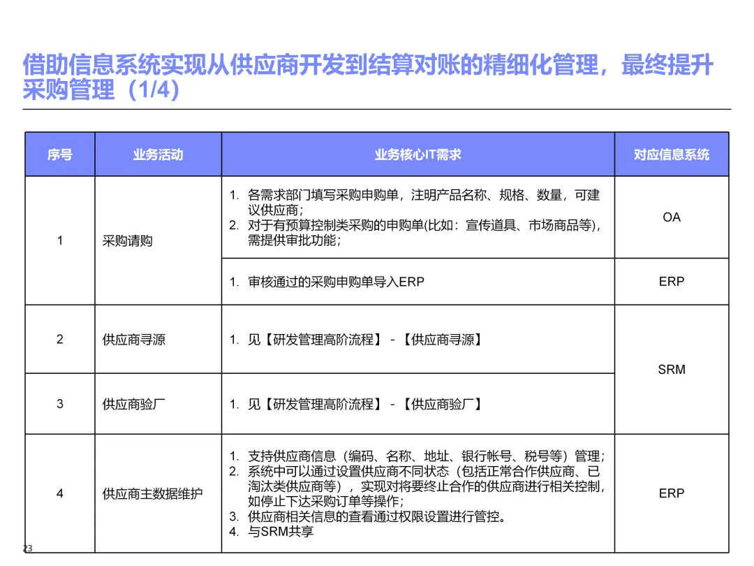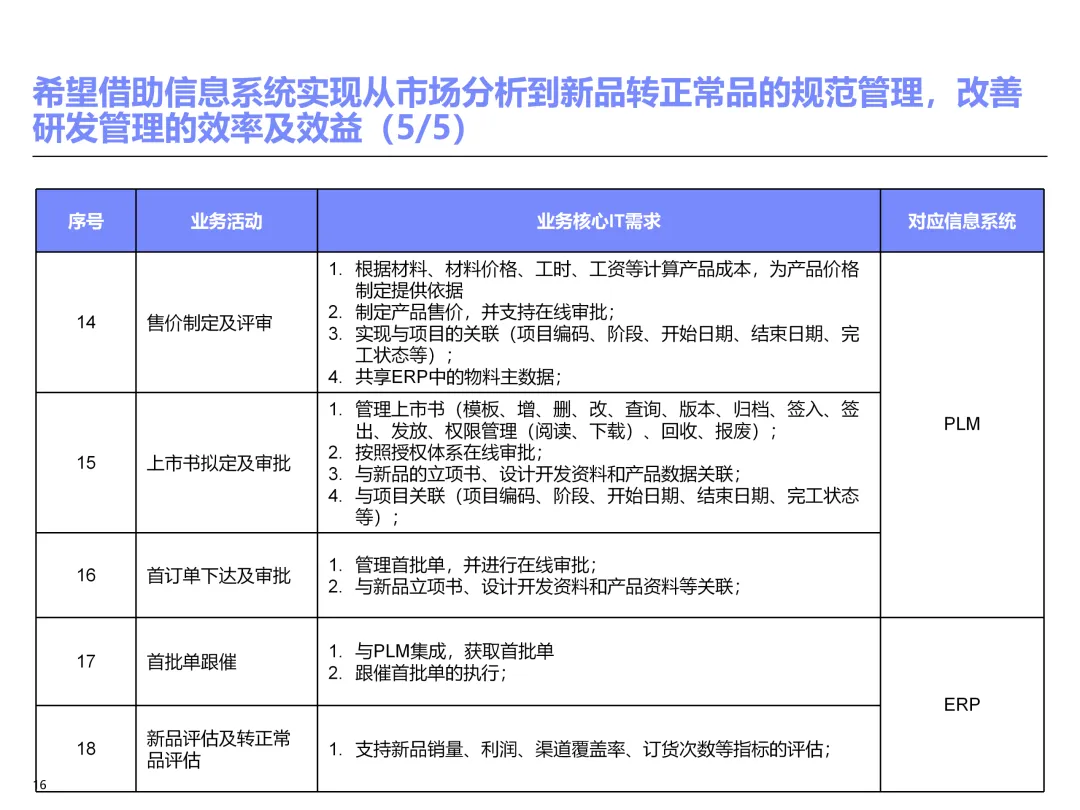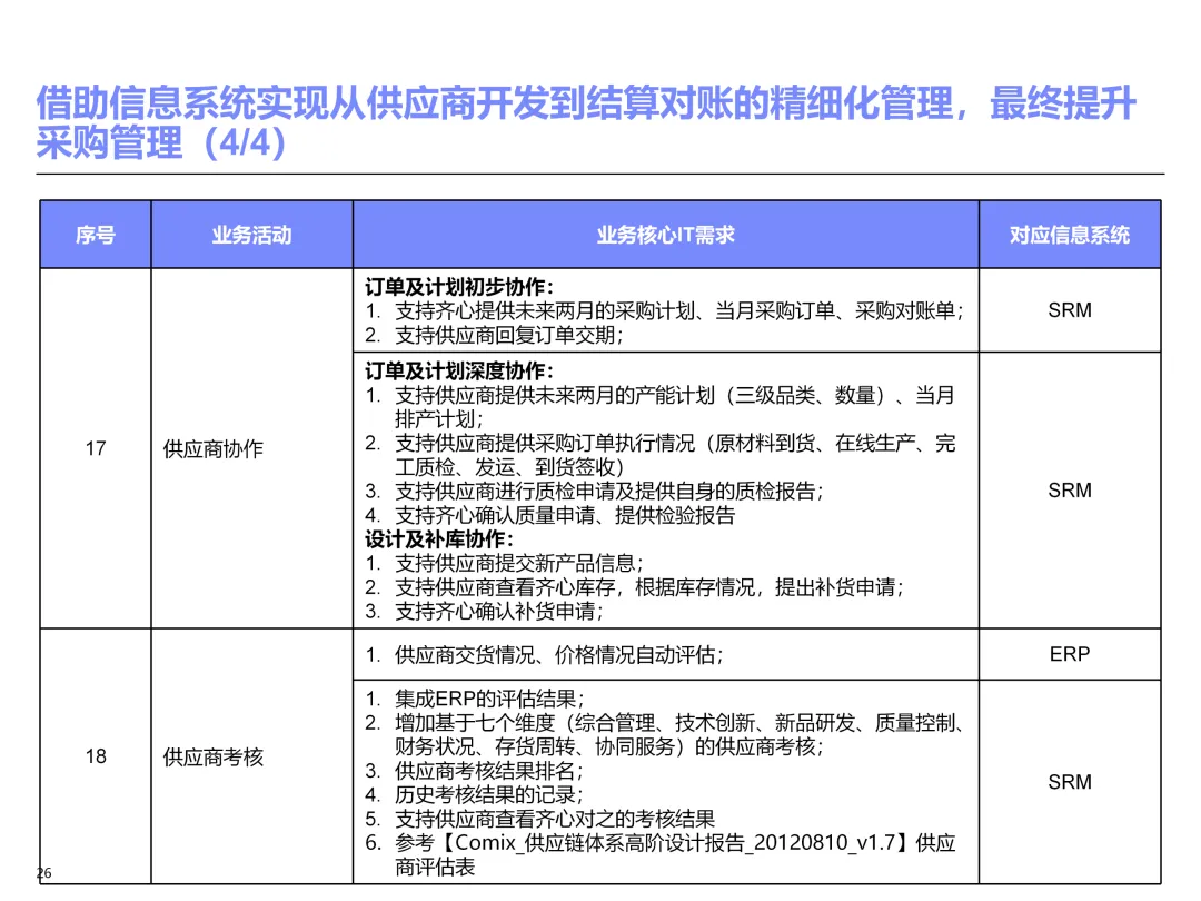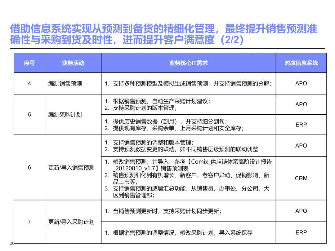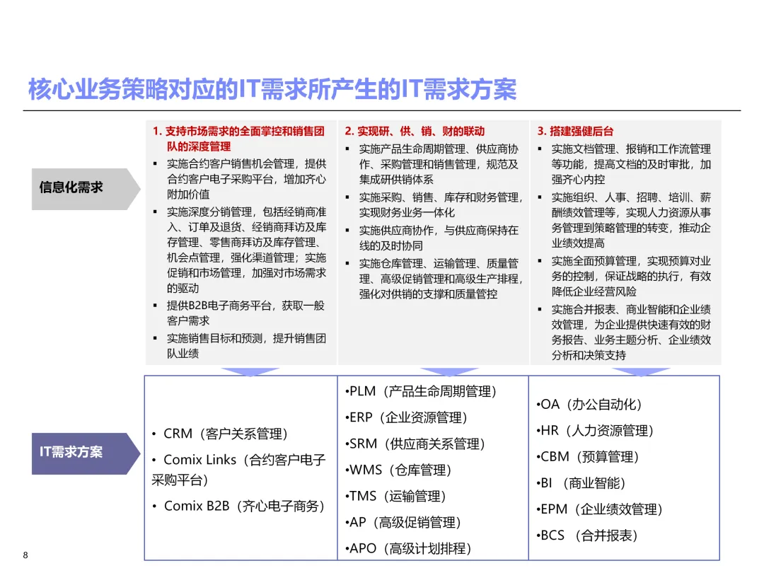 声明:本文内容来源于公众号“售前研究”,版权归原作者所有(如侵权,扫描上方二维码联系删除)。风陵渡进行深度解读,欢迎大家转载分享。上周一个老朋友找我,说他们集团要做数字化转型规划,让我推荐几份能“照着学”的参考材料。我翻了翻硬盘,把IBM这份《IT蓝图与实施规划》发给了他。为什么推荐这份?因为这是我见过的、最接近“教科书级别”的集团IT规划。虽然从PPT里的时间看(2012年),这已经是十多年前的案例了,但方法论到今天依然不过时。今天,我想以一个从业十五年的数字化顾问视角,拆解这份规划背后的三个“灵魂拷问”——这些问题,你在给任何一家集团做规划时,都绕不开。拷问一:你的IT规划,真的是从“战略”长出来的吗?很多企业的IT规划,开头也写“对齐战略”,但翻到后面你会发现,所谓的“对齐”就是把战略关键词塞进PPT封面,后面的系统清单跟战略半毛钱关系都没有。前端掌控:开拓合约业务、做实分销、整合代理、尝试电商 → 需要CRM、B2B、Comix Links中端高效:低本高效的供应体系、产销协同、优化O2C/P2P → 需要ERP、SRM、WMS、TMS、APO后端支撑:高适应性人才的人力资源体系 → 需要HR、OA、BI看到了吗?每一个战略方向,都直接对应了一组业务需求,而每一组业务需求,又直接对应了具体的IT系统。这才是真正的“战略驱动IT”。不是把战略写在PPT里当摆设,而是用战略做“筛子”,筛出哪些系统该上、哪些不该上。下次你做规划,不妨问客户一个问题:“明年你最想做成哪三件事?” 然后只围绕这三件事设计IT系统。其他的,再“先进”也先放一放。这就是战略对齐的本质——做减法。拷问二:你的蓝图,能经得起“流程推敲”吗?它没有停留在“我们要上CRM、上ERP”这种口号层面,而是把每个业务域都拆解到了高阶流程级别——研发管理:从市场分析→新品立项→打样→试产→首批单→上市,画了整整5页流程图计划管理:从销售预测→产销协同→采购计划→计划滚动,每个节点的数据流向都标得清清楚楚采购管理:从供应商寻源→验厂→配额管理→订单执行→对账结算,4页流程图覆盖全生命周期销售管理:从订单接单→信用检查→发货→对账→售后,同样是4页流程图更厉害的是,每个流程节点旁边,都标注了“IT需求”——这个地方需要系统做什么、需要什么数据、需要跟哪个系统集成。这才是真正的“业务与IT的桥梁”。你拿着这份规划,可以直接给开发团队派活:第3.2节流程的第7步,需要一个采购订单审批功能,去实现吧。很多顾问画的蓝图,业务部门看不懂,技术部门没法做,最后只能当墙纸贴起来。真正能落地的蓝图,一定是“流程穿透”的——你能沿着一条销售订单的轨迹,一路走通从CRM到ERP到WMS到TMS的全过程,并且知道每个节点系统要做什么。做不到这一点,你的蓝图就是一张废纸。拷问三:你的路线图,考虑过“依赖关系”吗?IT规划最容易犯的一个错误,就是把“想做的”当成“能做的”。一上来就想上BI、上AI、上智能制造,结果发现基础数据都没有,系统全在“裸奔”。IBM这份报告是怎么设计路线图的?它用了两个维度:高迫切+低难度:ERP一期(进销存财)、OA → 当期先上高迫切+高难度:CRM、PLM、BI → 近期攻坚低迫切+高难度:CBM、EPM、APO → 远期探索比如BI要上线,前提是什么?需要ERP、CRM、SRM这些业务系统先把数据生产出来。如果业务系统都没跑起来,BI就是个“没米下锅”的空壳。再比如APO(高级计划优化),它依赖什么?依赖历史销售数据、依赖准确的销售预测、依赖稳定的采购计划。这些东西从哪里来?从CRM和ERP里来。这就是“系统间的依赖关系”。先建的必须是后建的“数据源”。【未完...】