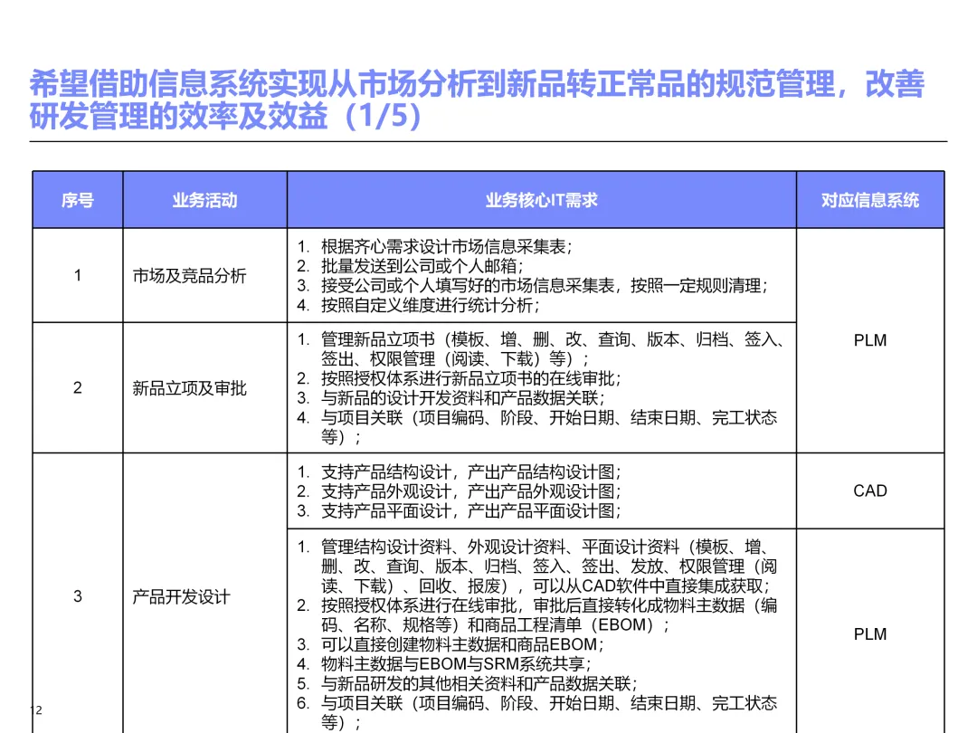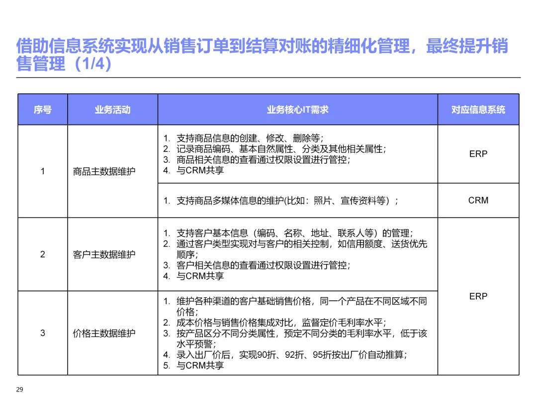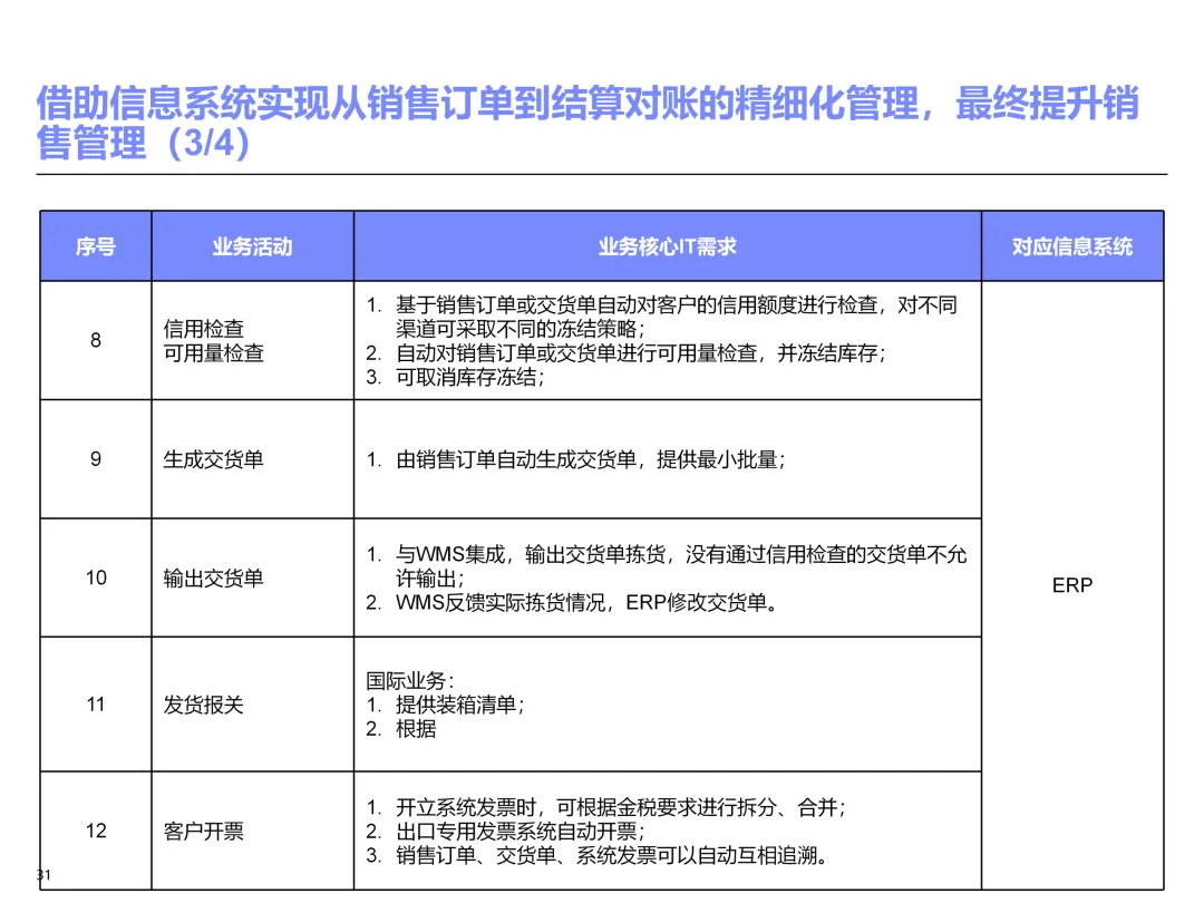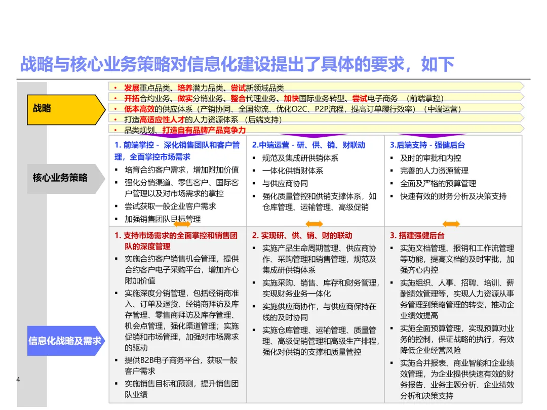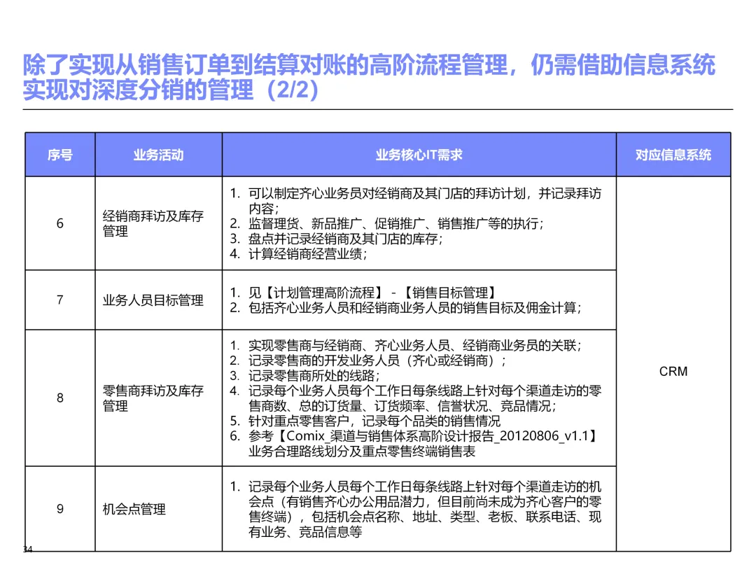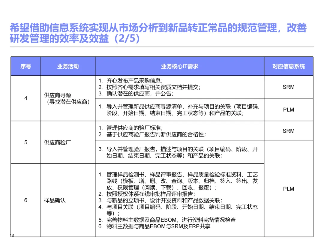 声明:本文内容来源于公众号“售前研究”,版权归原作者所有(如侵权,扫描上方二维码联系删除)。风陵渡进行深度解读,欢迎大家转载分享。上周一个老朋友找我,说他们集团要做数字化转型规划,让我推荐几份能“照着学”的参考材料。我翻了翻硬盘,把IBM这份《IT蓝图与实施规划》发给了他。为什么推荐这份?因为这是我见过的、最接近“教科书级别”的集团IT规划。虽然从PPT里的时间看(2012年),这已经是十多年前的案例了,但方法论到今天依然不过时。今天,我想以一个从业十五年的数字化顾问视角,拆解这份规划背后的三个“灵魂拷问”——这些问题,你在给任何一家集团做规划时,都绕不开。拷问一:你的IT规划,真的是从“战略”长出来的吗?很多企业的IT规划,开头也写“对齐战略”,但翻到后面你会发现,所谓的“对齐”就是把战略关键词塞进PPT封面,后面的系统清单跟战略半毛钱关系都没有。前端掌控:开拓合约业务、做实分销、整合代理、尝试电商 → 需要CRM、B2B、Comix Links中端高效:低本高效的供应体系、产销协同、优化O2C/P2P → 需要ERP、SRM、WMS、TMS、APO后端支撑:高适应性人才的人力资源体系 → 需要HR、OA、BI看到了吗?每一个战略方向,都直接对应了一组业务需求,而每一组业务需求,又直接对应了具体的IT系统。这才是真正的“战略驱动IT”。不是把战略写在PPT里当摆设,而是用战略做“筛子”,筛出哪些系统该上、哪些不该上。下次你做规划,不妨问客户一个问题:“明年你最想做成哪三件事?” 然后只围绕这三件事设计IT系统。其他的,再“先进”也先放一放。这就是战略对齐的本质——做减法。拷问二:你的蓝图,能经得起“流程推敲”吗?它没有停留在“我们要上CRM、上ERP”这种口号层面,而是把每个业务域都拆解到了高阶流程级别——研发管理:从市场分析→新品立项→打样→试产→首批单→上市,画了整整5页流程图计划管理:从销售预测→产销协同→采购计划→计划滚动,每个节点的数据流向都标得清清楚楚采购管理:从供应商寻源→验厂→配额管理→订单执行→对账结算,4页流程图覆盖全生命周期销售管理:从订单接单→信用检查→发货→对账→售后,同样是4页流程图更厉害的是,每个流程节点旁边,都标注了“IT需求”——这个地方需要系统做什么、需要什么数据、需要跟哪个系统集成。这才是真正的“业务与IT的桥梁”。你拿着这份规划,可以直接给开发团队派活:第3.2节流程的第7步,需要一个采购订单审批功能,去实现吧。很多顾问画的蓝图,业务部门看不懂,技术部门没法做,最后只能当墙纸贴起来。真正能落地的蓝图,一定是“流程穿透”的——你能沿着一条销售订单的轨迹,一路走通从CRM到ERP到WMS到TMS的全过程,并且知道每个节点系统要做什么。做不到这一点,你的蓝图就是一张废纸。拷问三:你的路线图,考虑过“依赖关系”吗?IT规划最容易犯的一个错误,就是把“想做的”当成“能做的”。一上来就想上BI、上AI、上智能制造,结果发现基础数据都没有,系统全在“裸奔”。IBM这份报告是怎么设计路线图的?它用了两个维度:高迫切+低难度:ERP一期(进销存财)、OA → 当期先上高迫切+高难度:CRM、PLM、BI → 近期攻坚低迫切+高难度:CBM、EPM、APO → 远期探索比如BI要上线,前提是什么?需要ERP、CRM、SRM这些业务系统先把数据生产出来。如果业务系统都没跑起来,BI就是个“没米下锅”的空壳。再比如APO(高级计划优化),它依赖什么?依赖历史销售数据、依赖准确的销售预测、依赖稳定的采购计划。这些东西从哪里来?从CRM和ERP里来。这就是“系统间的依赖关系”。先建的必须是后建的“数据源”。【未完...】