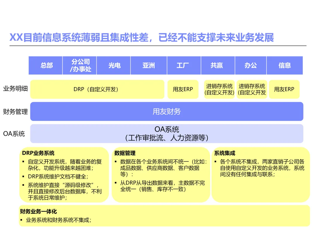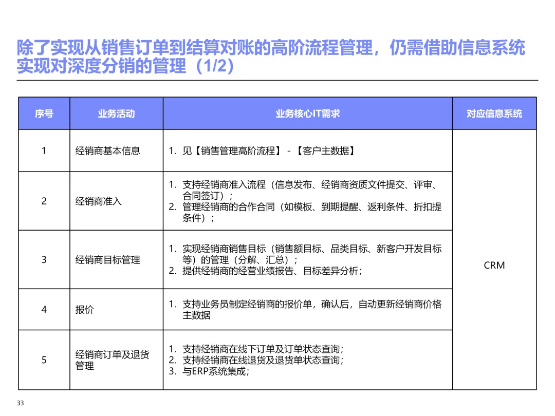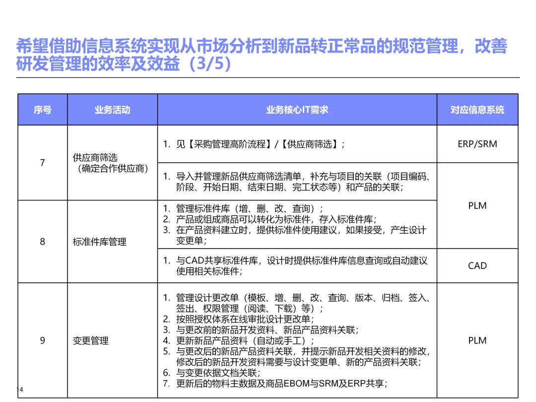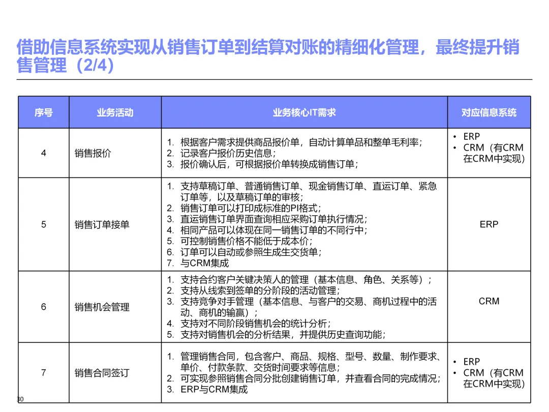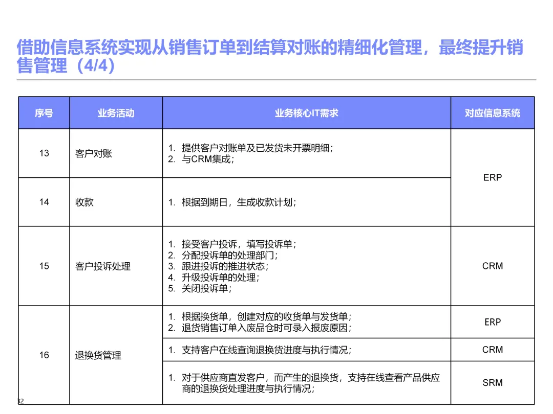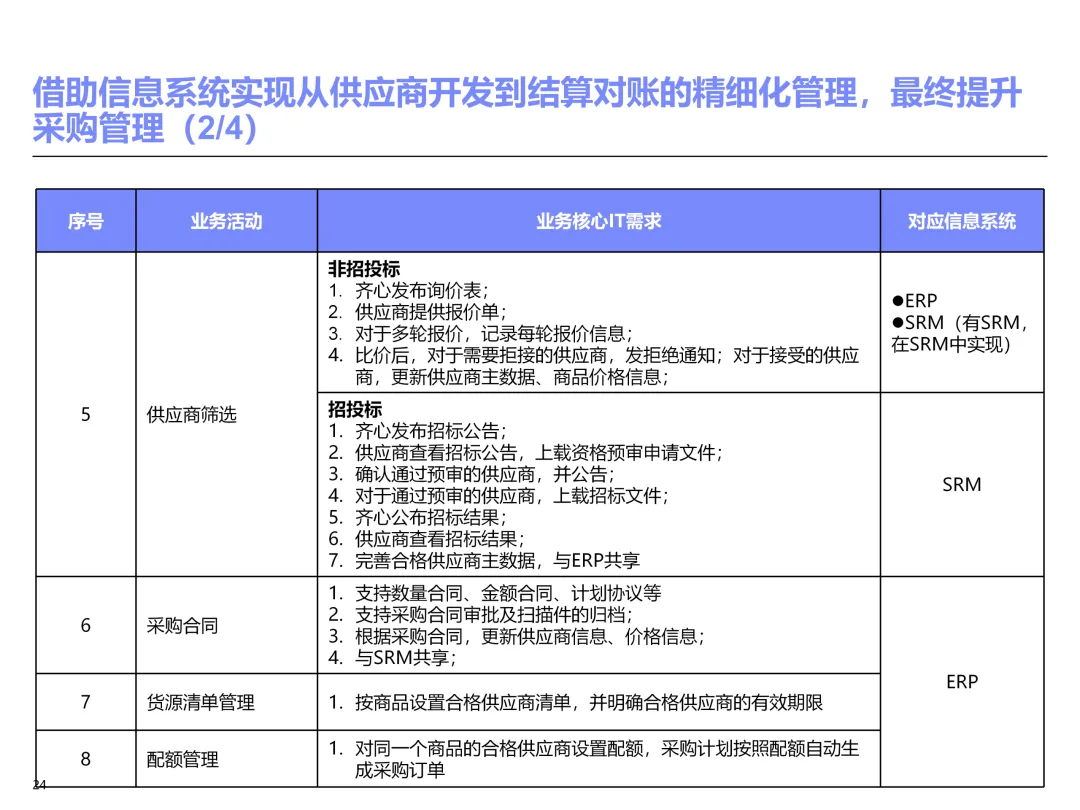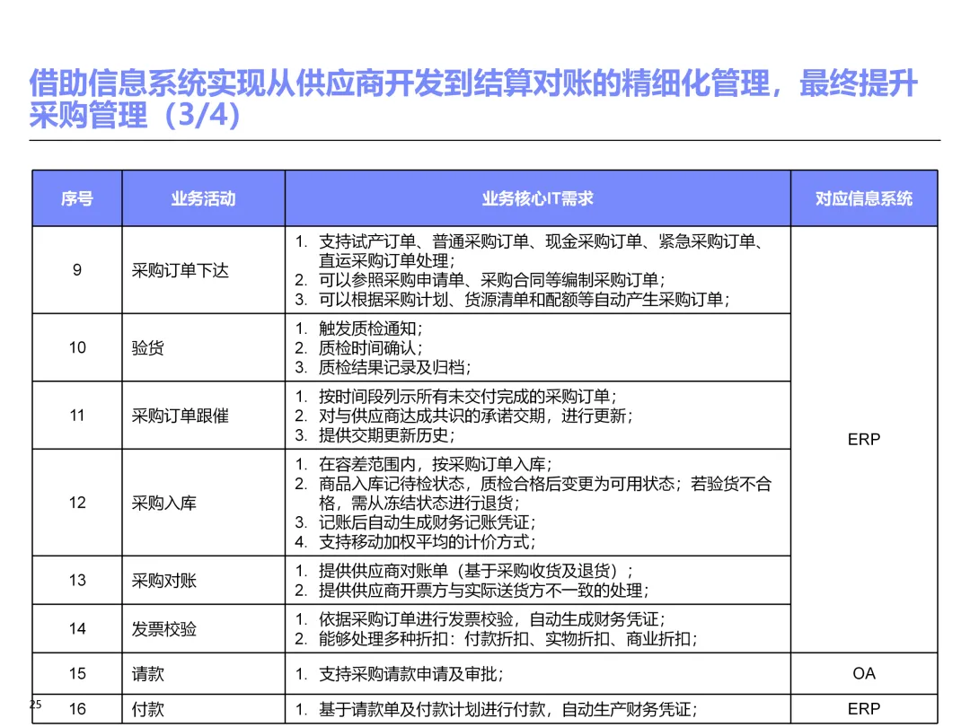 声明:本文内容来源于公众号“售前研究”,版权归原作者所有(如侵权,扫描上方二维码联系删除)。风陵渡进行深度解读,欢迎大家转载分享。上周一个老朋友找我,说他们集团要做数字化转型规划,让我推荐几份能“照着学”的参考材料。我翻了翻硬盘,把IBM这份《IT蓝图与实施规划》发给了他。为什么推荐这份?因为这是我见过的、最接近“教科书级别”的集团IT规划。虽然从PPT里的时间看(2012年),这已经是十多年前的案例了,但方法论到今天依然不过时。今天,我想以一个从业十五年的数字化顾问视角,拆解这份规划背后的三个“灵魂拷问”——这些问题,你在给任何一家集团做规划时,都绕不开。拷问一:你的IT规划,真的是从“战略”长出来的吗?很多企业的IT规划,开头也写“对齐战略”,但翻到后面你会发现,所谓的“对齐”就是把战略关键词塞进PPT封面,后面的系统清单跟战略半毛钱关系都没有。前端掌控:开拓合约业务、做实分销、整合代理、尝试电商 → 需要CRM、B2B、Comix Links中端高效:低本高效的供应体系、产销协同、优化O2C/P2P → 需要ERP、SRM、WMS、TMS、APO后端支撑:高适应性人才的人力资源体系 → 需要HR、OA、BI看到了吗?每一个战略方向,都直接对应了一组业务需求,而每一组业务需求,又直接对应了具体的IT系统。这才是真正的“战略驱动IT”。不是把战略写在PPT里当摆设,而是用战略做“筛子”,筛出哪些系统该上、哪些不该上。下次你做规划,不妨问客户一个问题:“明年你最想做成哪三件事?” 然后只围绕这三件事设计IT系统。其他的,再“先进”也先放一放。这就是战略对齐的本质——做减法。拷问二:你的蓝图,能经得起“流程推敲”吗?它没有停留在“我们要上CRM、上ERP”这种口号层面,而是把每个业务域都拆解到了高阶流程级别——研发管理:从市场分析→新品立项→打样→试产→首批单→上市,画了整整5页流程图计划管理:从销售预测→产销协同→采购计划→计划滚动,每个节点的数据流向都标得清清楚楚采购管理:从供应商寻源→验厂→配额管理→订单执行→对账结算,4页流程图覆盖全生命周期销售管理:从订单接单→信用检查→发货→对账→售后,同样是4页流程图更厉害的是,每个流程节点旁边,都标注了“IT需求”——这个地方需要系统做什么、需要什么数据、需要跟哪个系统集成。这才是真正的“业务与IT的桥梁”。你拿着这份规划,可以直接给开发团队派活:第3.2节流程的第7步,需要一个采购订单审批功能,去实现吧。很多顾问画的蓝图,业务部门看不懂,技术部门没法做,最后只能当墙纸贴起来。真正能落地的蓝图,一定是“流程穿透”的——你能沿着一条销售订单的轨迹,一路走通从CRM到ERP到WMS到TMS的全过程,并且知道每个节点系统要做什么。做不到这一点,你的蓝图就是一张废纸。拷问三:你的路线图,考虑过“依赖关系”吗?IT规划最容易犯的一个错误,就是把“想做的”当成“能做的”。一上来就想上BI、上AI、上智能制造,结果发现基础数据都没有,系统全在“裸奔”。IBM这份报告是怎么设计路线图的?它用了两个维度:高迫切+低难度:ERP一期(进销存财)、OA → 当期先上高迫切+高难度:CRM、PLM、BI → 近期攻坚低迫切+高难度:CBM、EPM、APO → 远期探索比如BI要上线,前提是什么?需要ERP、CRM、SRM这些业务系统先把数据生产出来。如果业务系统都没跑起来,BI就是个“没米下锅”的空壳。再比如APO(高级计划优化),它依赖什么?依赖历史销售数据、依赖准确的销售预测、依赖稳定的采购计划。这些东西从哪里来?从CRM和ERP里来。这就是“系统间的依赖关系”。先建的必须是后建的“数据源”。【未完...】