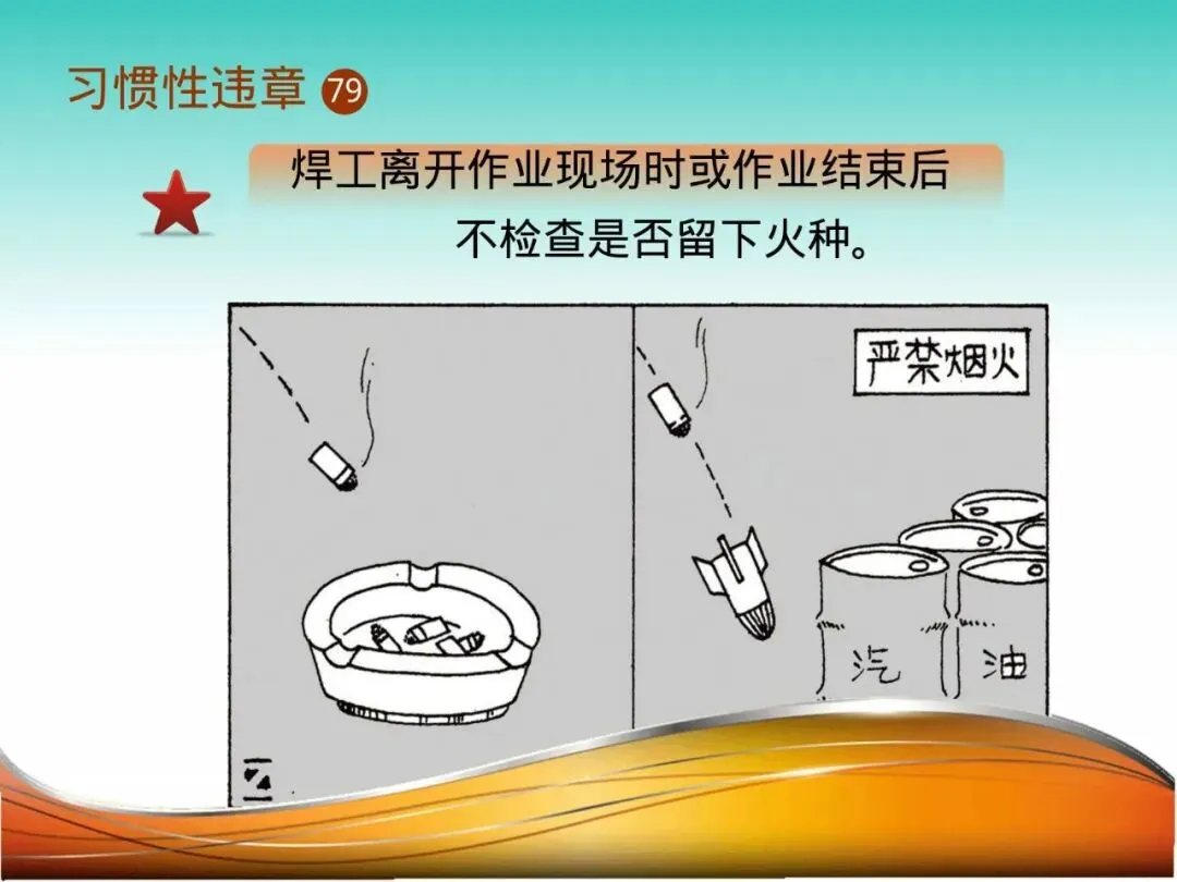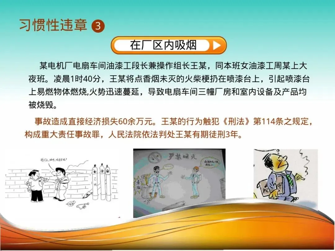 3.在厂区内吸烟:某化工厂区,员工张某在禁止吸烟的区域躲藏吸烟,烟头引燃地沟内残留的可燃挥发物,瞬间引发爆燃,酿成大火。厂区吸烟禁令针对的是特定风险环境,绝非剥夺权利,而是对集体生命的负责。