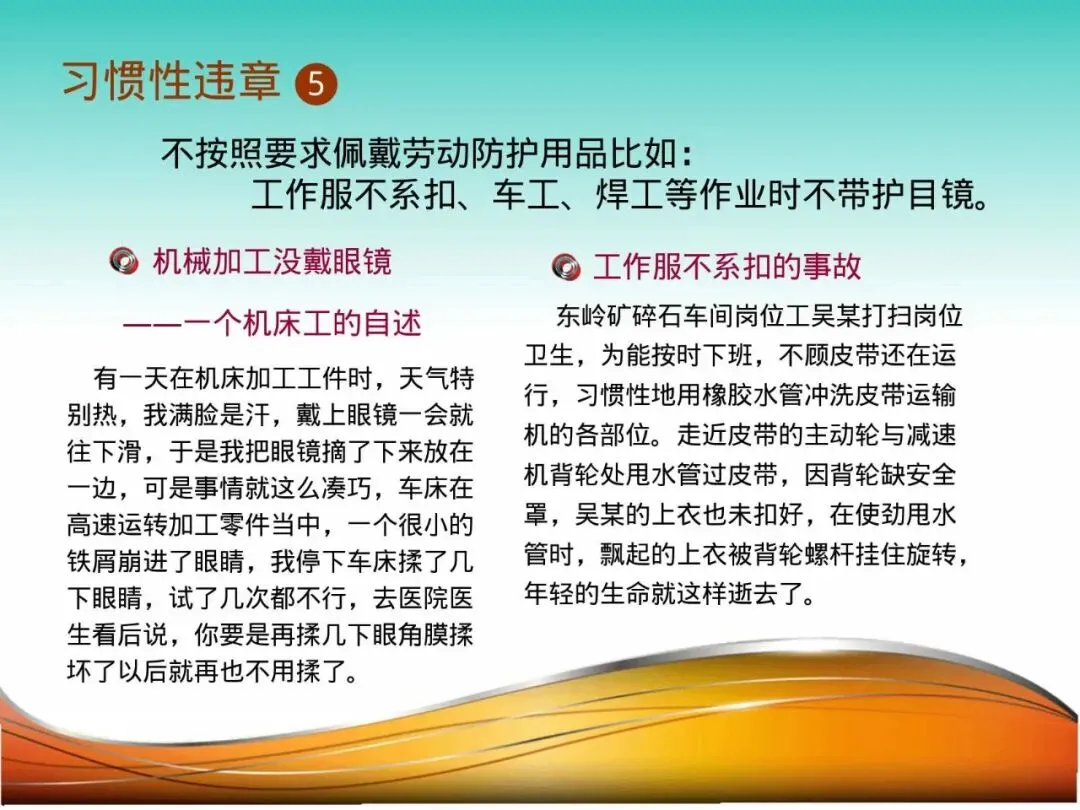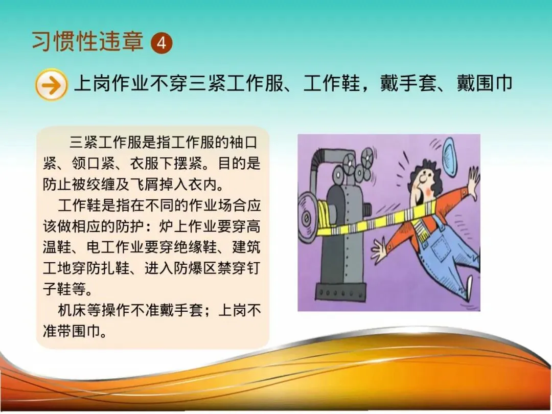 4.不穿规范工作服、不系扣:车工小赵,因天气炎热未穿“三紧”工作服,衣角被旋转的机床主轴缠绕,整个人被拽向机器,险些造成严重伤害。宽松的衣物、飘荡的围巾、未戴的手套,在机械面前都是致命的“陷阱”。