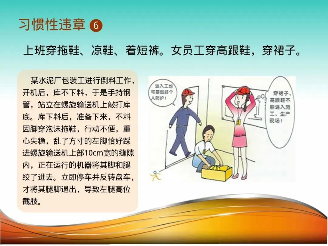 6.着装不合规(拖鞋、高跟鞋、裙子等):统计员孙女士,穿高跟鞋进入生产车间巡检,脚下打滑摔倒,脚踝严重扭伤,同时碰倒了旁边的巡检记录架。生产现场不是秀场,合脚的防滑鞋、利落的着装,是保障自身行动安全的基础。