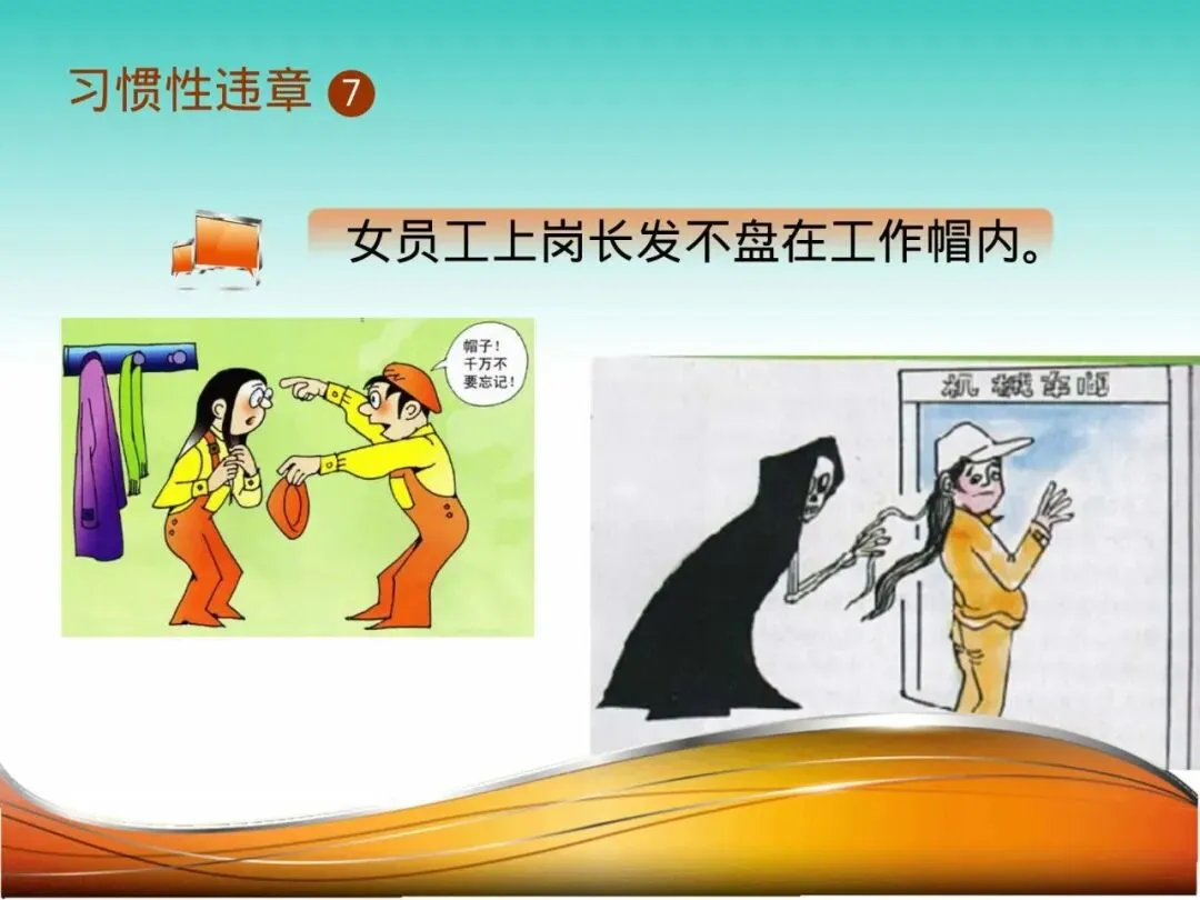 7.女员工长发未盘入帽内:操作工小周,长发披肩,在操作旋转的搅拌设备时,发梢被设备转轴卷入,导致头皮撕脱伤。这绝不是危言耸听,长发、松散的衣服必须被严格约束。