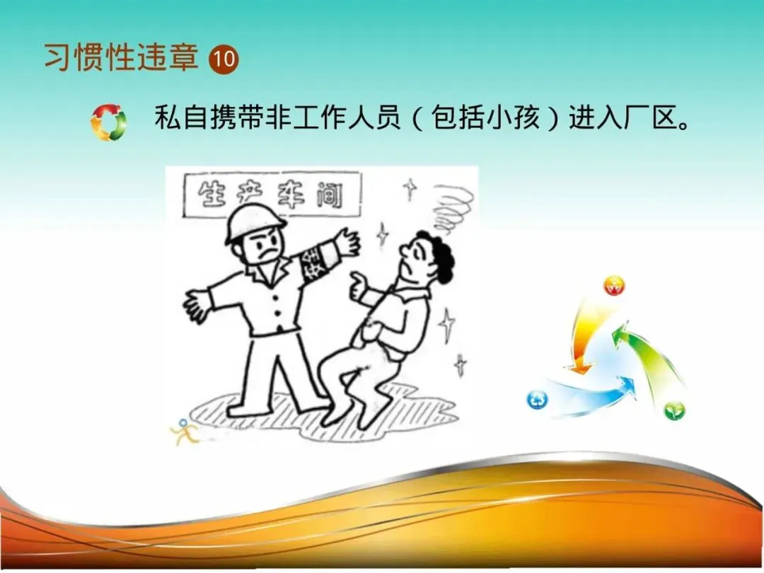 10.私自携带非工作人员入厂:员工吴某周末加班,私自将年幼孩子带入厂区玩耍。孩子好奇爬入一台暂停检修的设备内部,恰好设备进行临时测试启动,酿成无法挽回的悲剧。厂区风险无处不在,非工作人员缺乏辨识与应对能力。