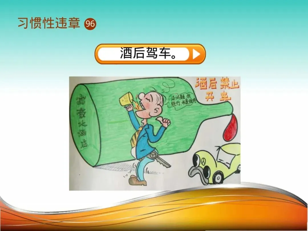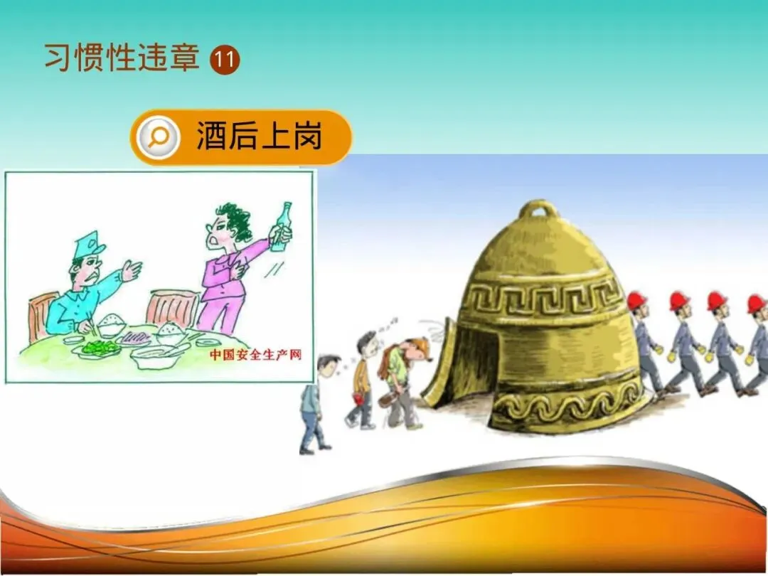 11.酒后上岗:司机郑某午餐饮酒,下午仍驾驶厂内重型车辆。反应迟钝、判断力下降,在倒车时未能观察清楚后方情况,撞倒围墙,险伤路人。酒精与安全生产绝对水火不容。