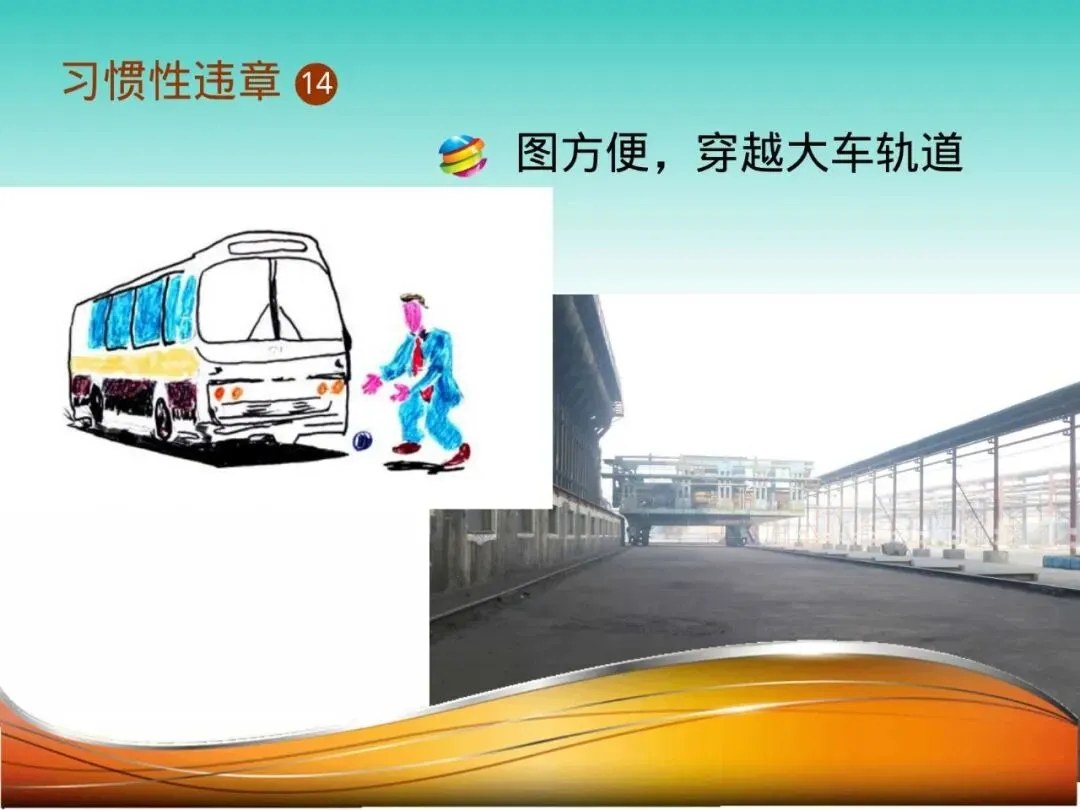 14.穿越大车轨道:员工刘某为省绕行时间,在火车机车缓慢移动时冒险从车头前抢行。司机视线存在盲区,且火车启动加速度判断困难,刘某被刮倒碾压,当场身亡。宁绕百步远,不冒一步险。
