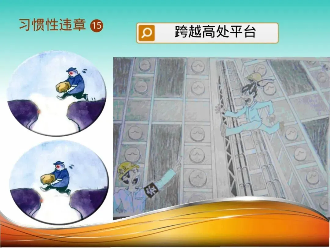 15.跨越高处平台:两名平台间距离约1米,虽有护栏隔开,但检修工周某为传递工具,直接跨越。失去平衡坠落,幸被安全网挂住,但已造成惊吓和擦伤。任何时候都应使用通道或搭设可靠临时平台。