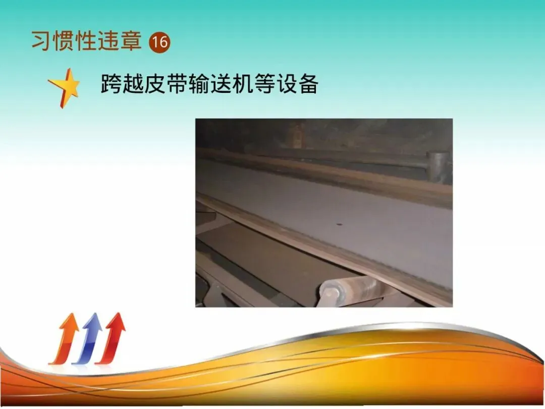 16.跨越皮带输送机:清洁工韩某,为清扫对面垃圾,直接抬腿跨越正在慢速运行的皮带。裤脚被皮带辊卷入,连带整个人被拖拽,腿部重伤。运行的皮带就是一只“机械巨蟒”,必须从专用过桥通行。