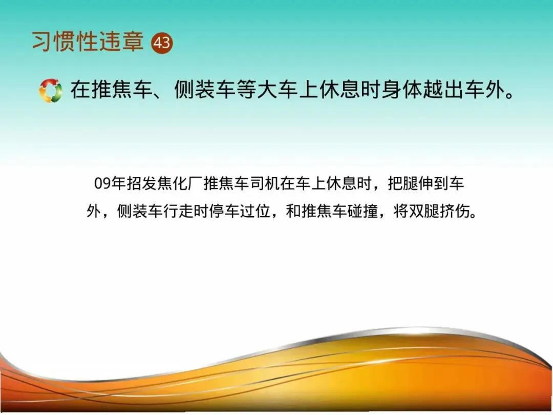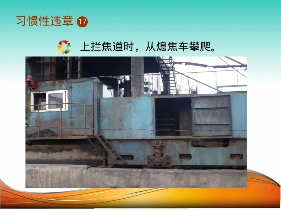 17.从熄焦车等处攀爬:焦化厂员工,为快速登上拦焦车操作平台,从移动的熄焦车车体攀爬。熄焦车突然启动或摆动,导致其跌落车下,被车轮轧过。上下设备必须待其停稳并走专用梯子。