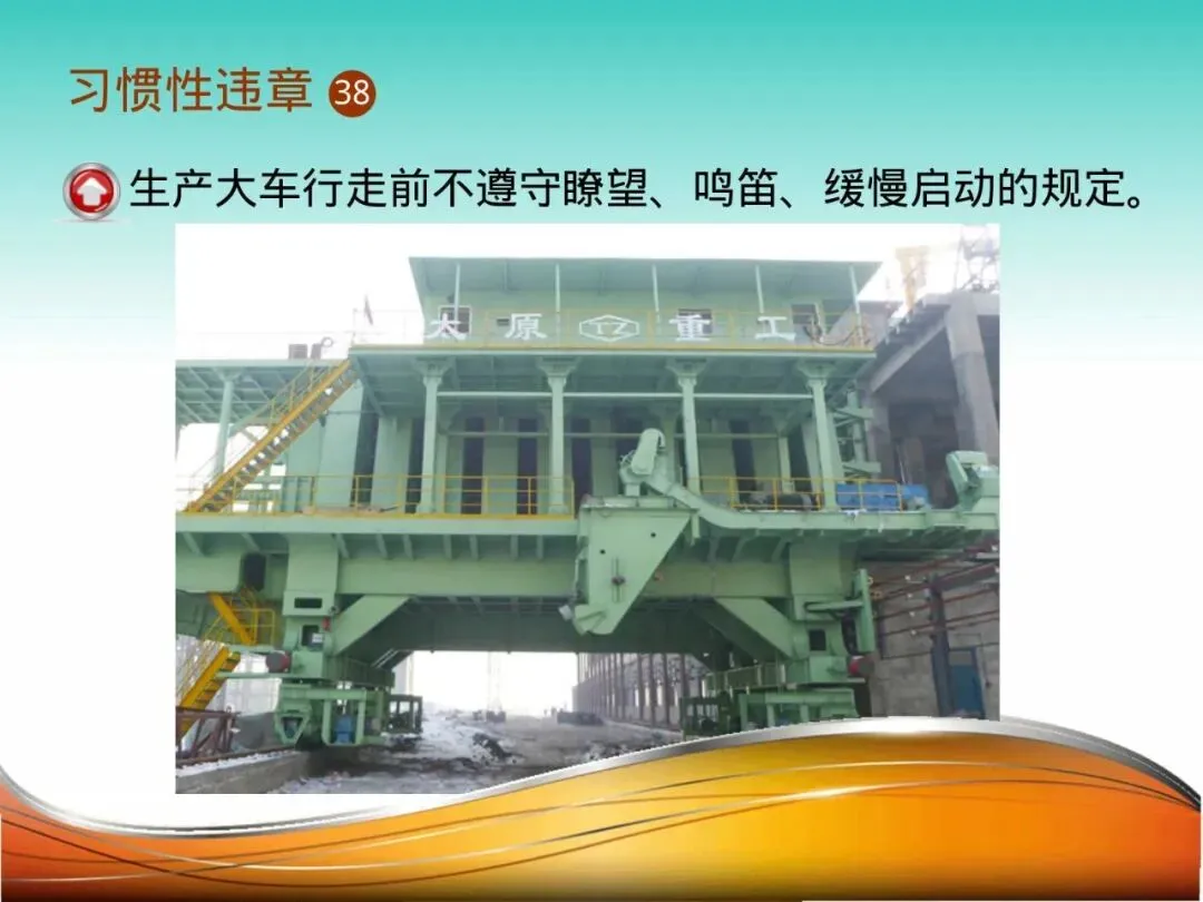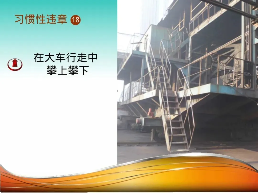 18.大车行走中攀上攀下:天车操作员陈某,在天车(行车)未完全停稳时便匆忙下车,跳向地面平台。因惯性跌落,磕碰在钢结构上。必须遵循“车停稳,再上下”的铁律。