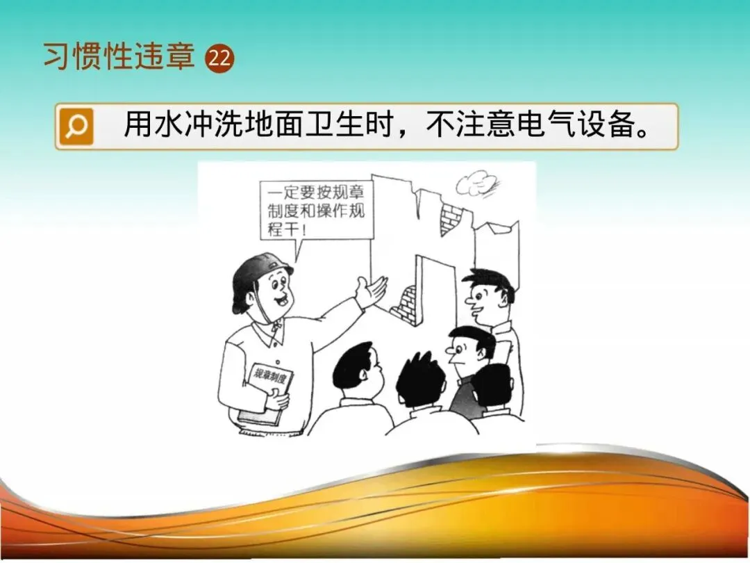 21.用水冲洗地面时不注意电气设备:保洁员用高压水枪冲洗车间地面,水雾溅入旁边的配电柜,导致线路短路,全车间停电,并引发电气火灾。冲洗前必须对电气设备进行防水遮盖或确认其防护等级足够。
