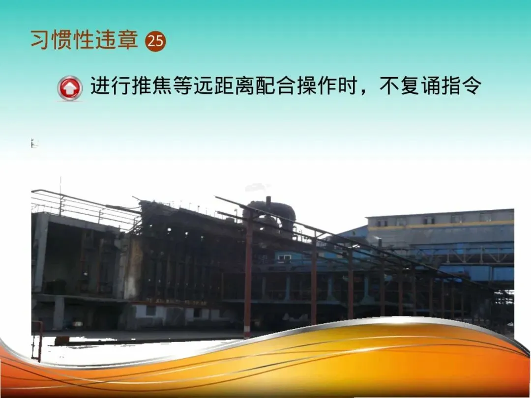 24.远距离配合操作不复诵指令:在焦炉推焦作业中,司机听到指令后未复诵确认,错误理解指令方向,推焦杆撞向炉体,造成设备严重损坏,并可能引发红焦落地恶性事故。复诵是确保指令准确无误传达的最后一道关口。