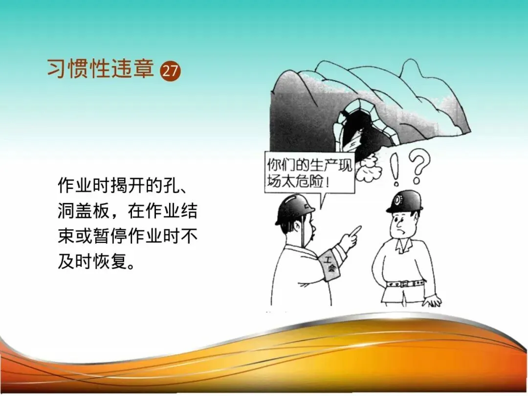26.孔洞盖板未及时恢复:检修人员打开地下管廊盖板作业,中途休息时未恢复盖板,也未设置临时护栏。一名路过的员工不慎跌入3米深的管廊,造成重伤。揭开的是盖板,打开的可能是“地狱之门”,必须做到“人离盖板合”或“设障不离人”。