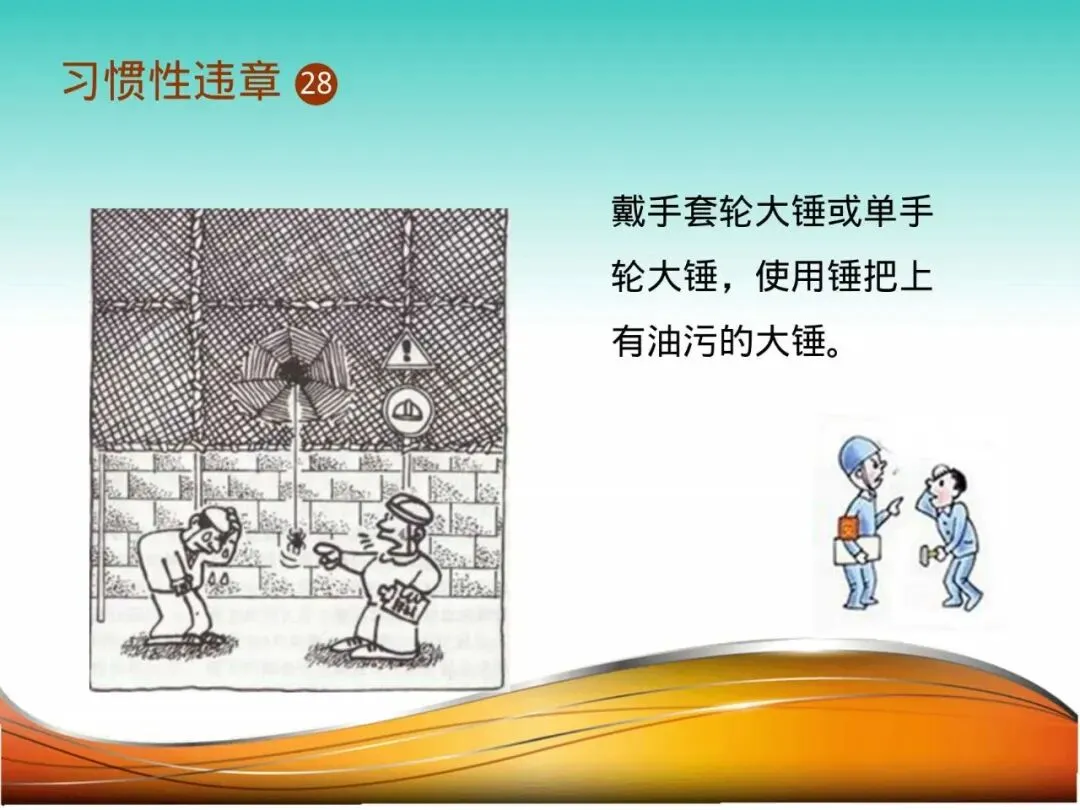 27.戴手套或单手轮大锤、使用油污锤把:钳工王某戴棉纱手套轮大锤砸击工件,锤头脱手飞出,击中对面工友,致其重伤。戴手套减小了握持摩擦力,油污的锤把更是让锤子变成“飞弹”。单手轮锤则无法控制平衡与方向。