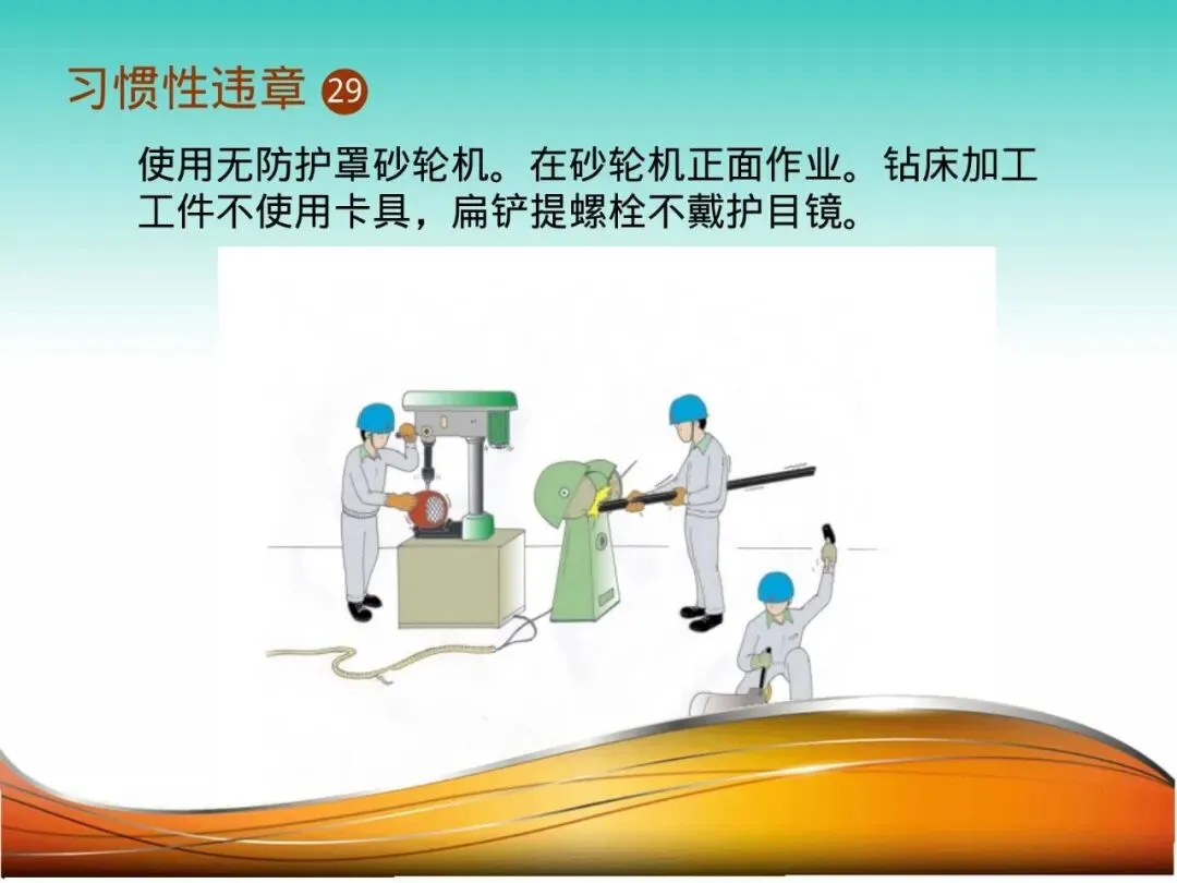 28.使用无防护罩砂轮机、正面作业:员工使用砂轮切割片已破损、且防护罩被拆除的角磨机进行切割。砂轮片突然爆裂,碎片高速飞出,击中其腹部和腿部,造成严重切割伤。砂轮机的防护罩是防止碎片飞溅的生命盾牌,绝对不可拆除。正面站立则将自己置于碎片飞溅的弹道上。