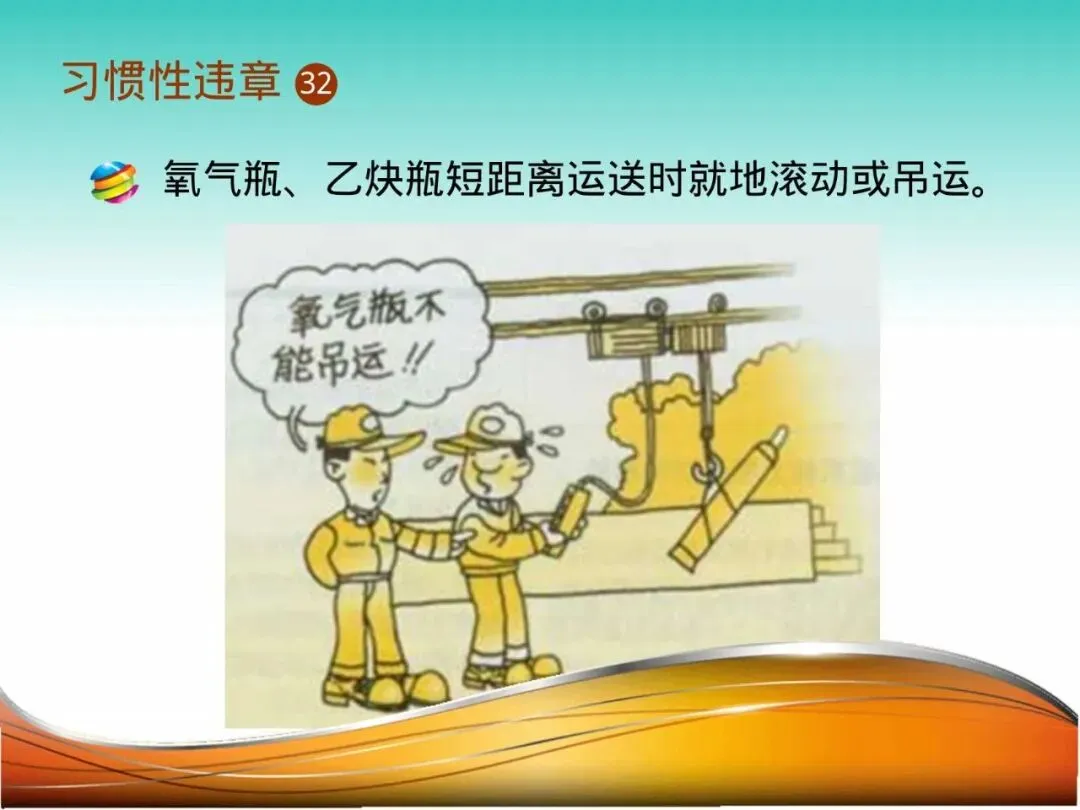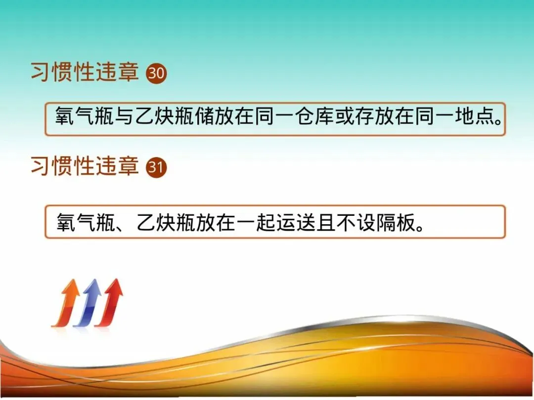 30.氧气瓶与乙炔瓶混存:在某工地临时仓库,氧气瓶和乙炔瓶被随意放置在一起。乙炔瓶发生轻微泄漏,遇明火(可能是外部溅入的火花)引发爆炸,氧气瓶在富氧环境下继而发生更猛烈的二次爆炸,整个仓库被毁。氧气助燃,乙炔易燃,两者结合就是一枚“炸弹”,必须严格分开放置,间距不得少于5米,且有隔离措施。