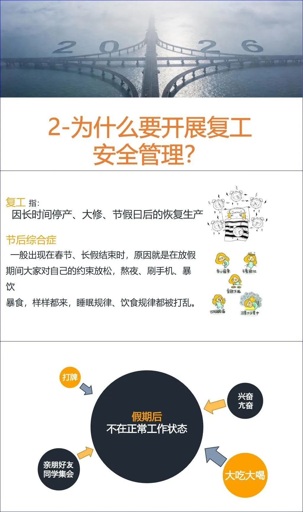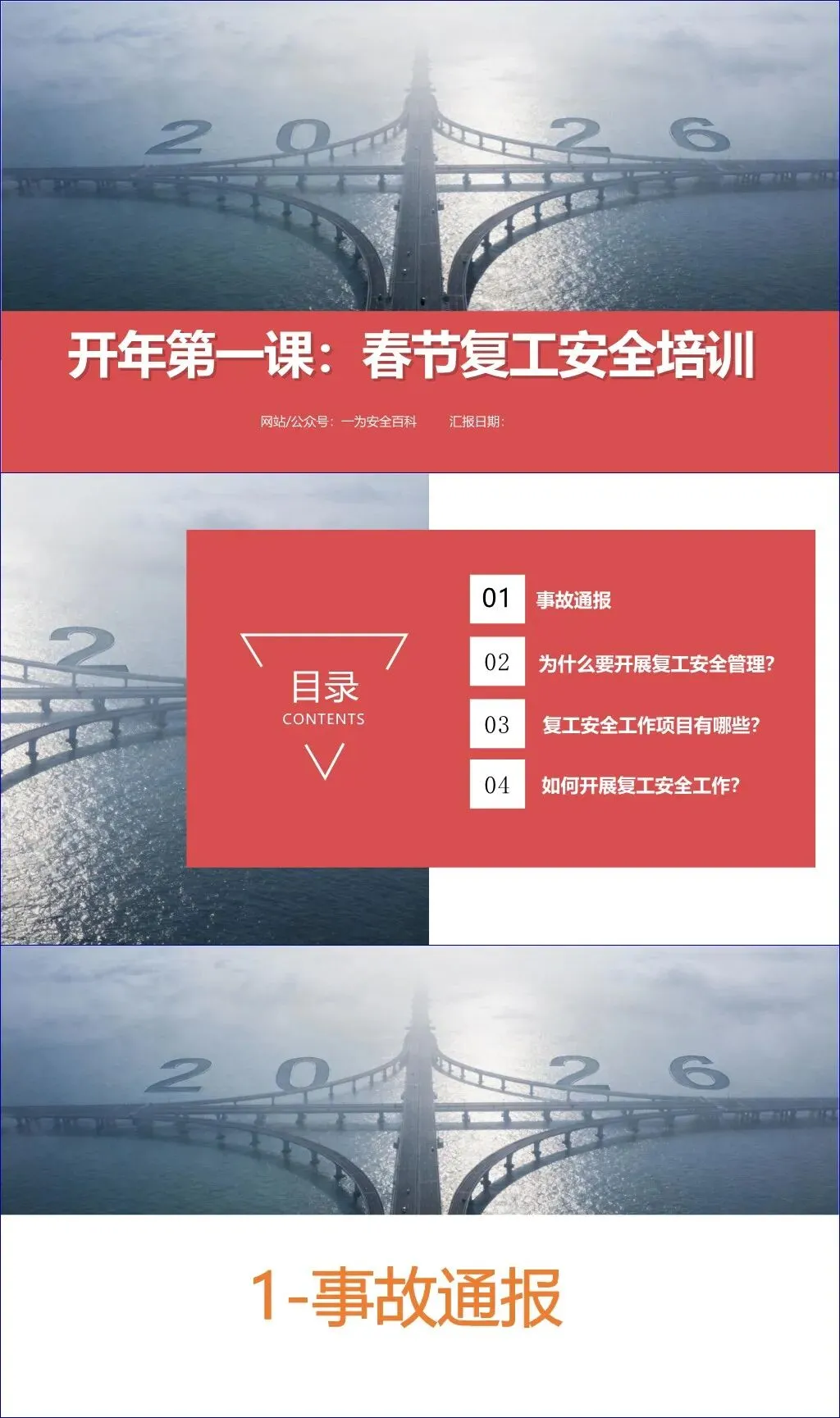 《开年第一课:春节复工安全培训》,旨在通过事故通报、原因分析及具体措施,指导企业在春节后安全复工复产。主要内容分为四个部分:1. 事故通报与警示