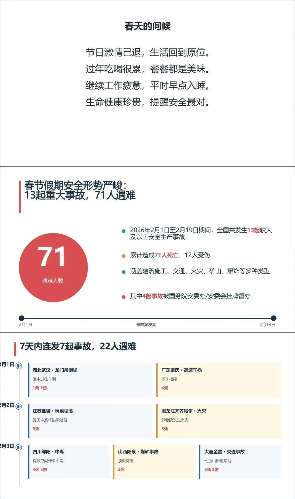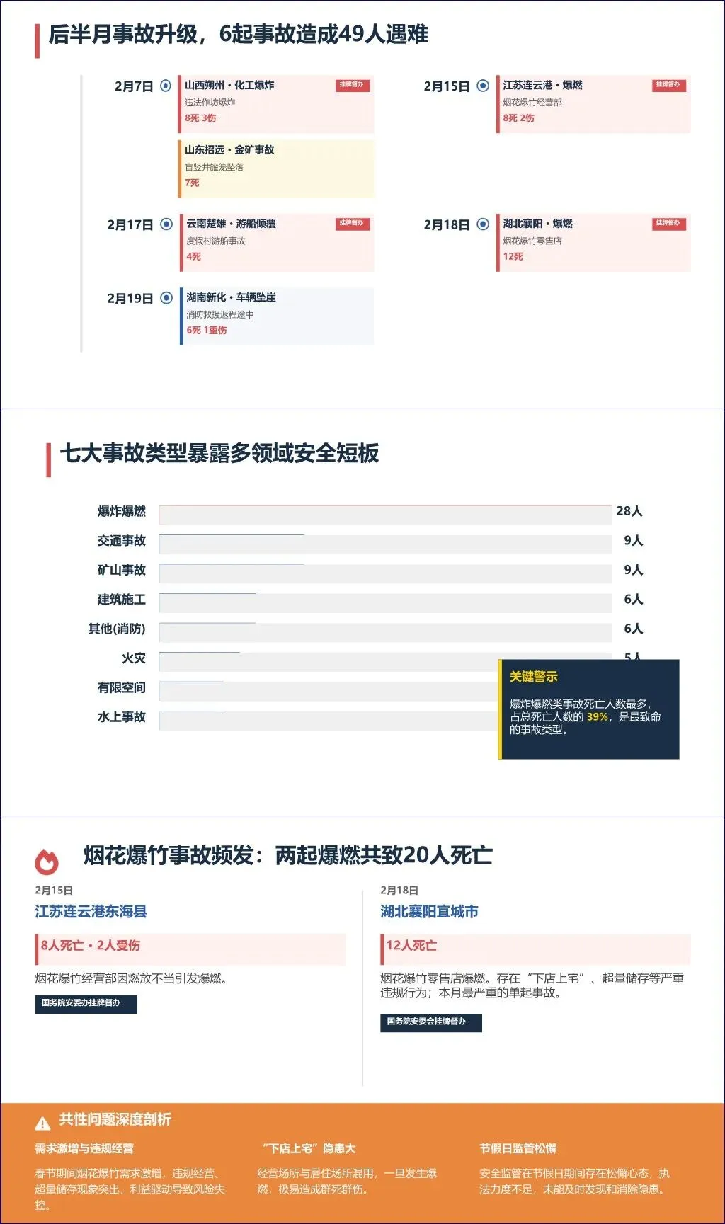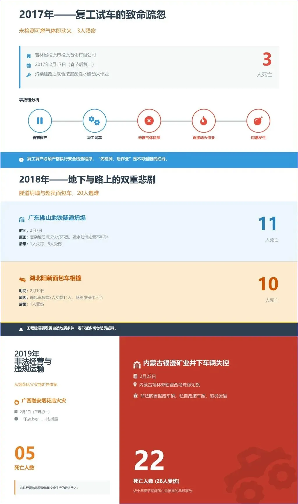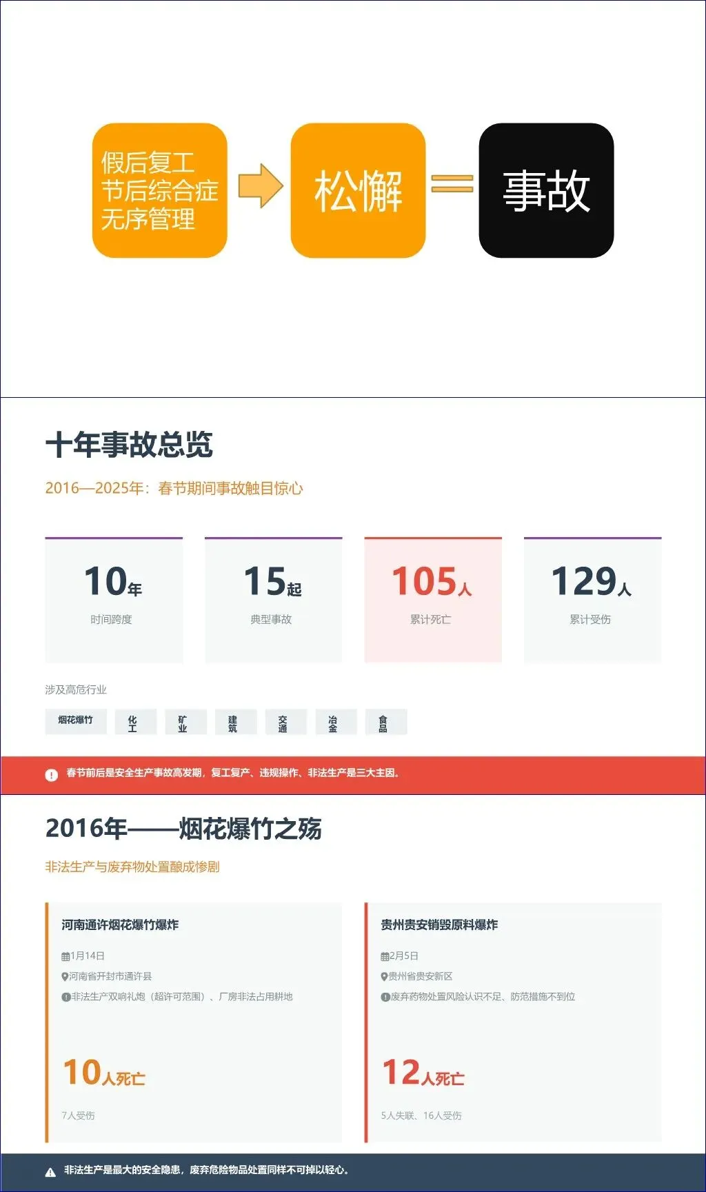 历史数据: 过去十年春节前后是事故高发期,复工复产、违规操作和非法生产是三大主因。