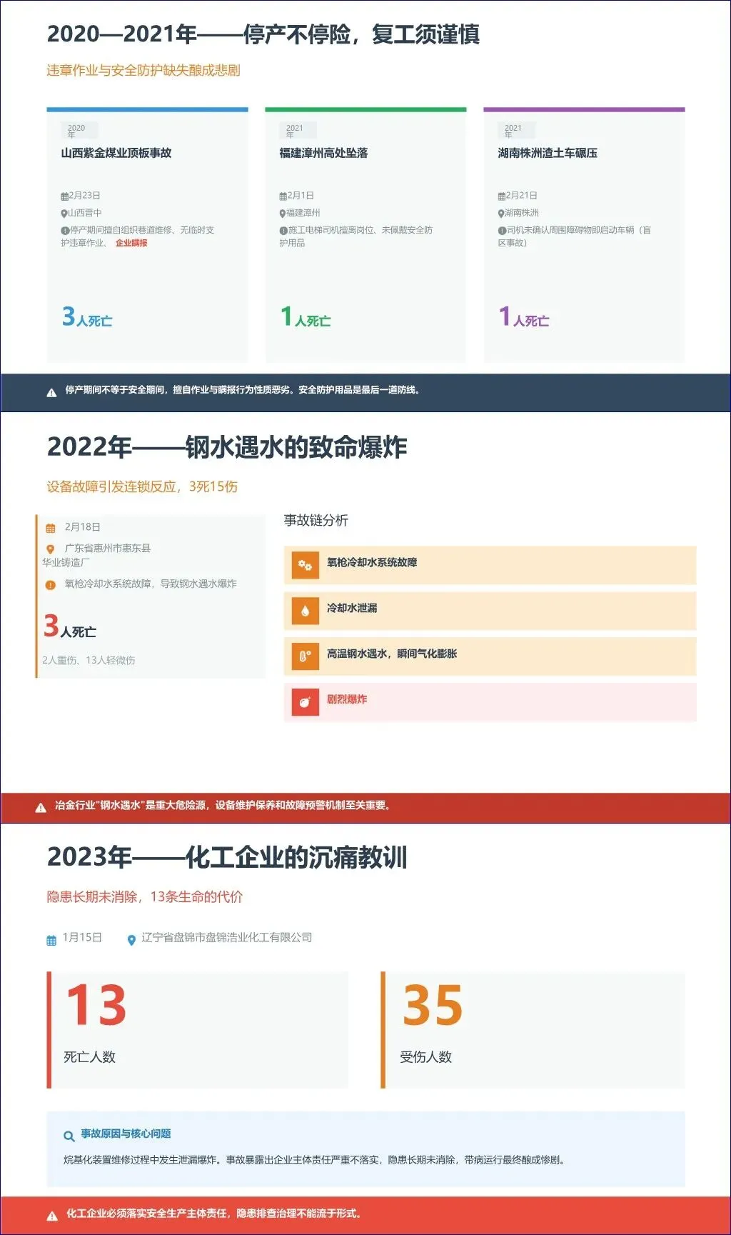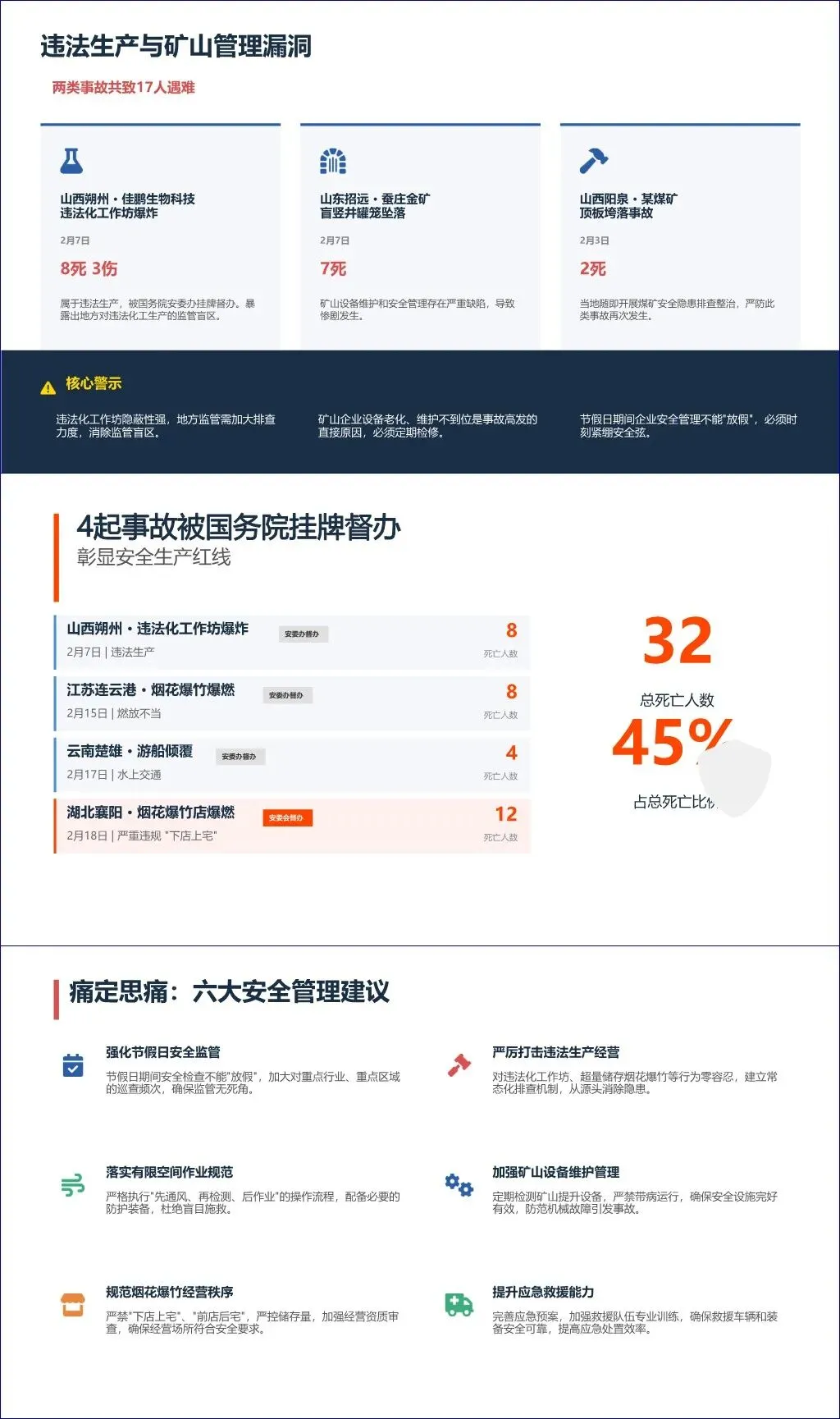 核心教训: 违法生产、违规操作、设备带病运行、节后思想松懈是事故主因。国务院安委办对多起严重事故进行了挂牌督办,强调安全生产红线。