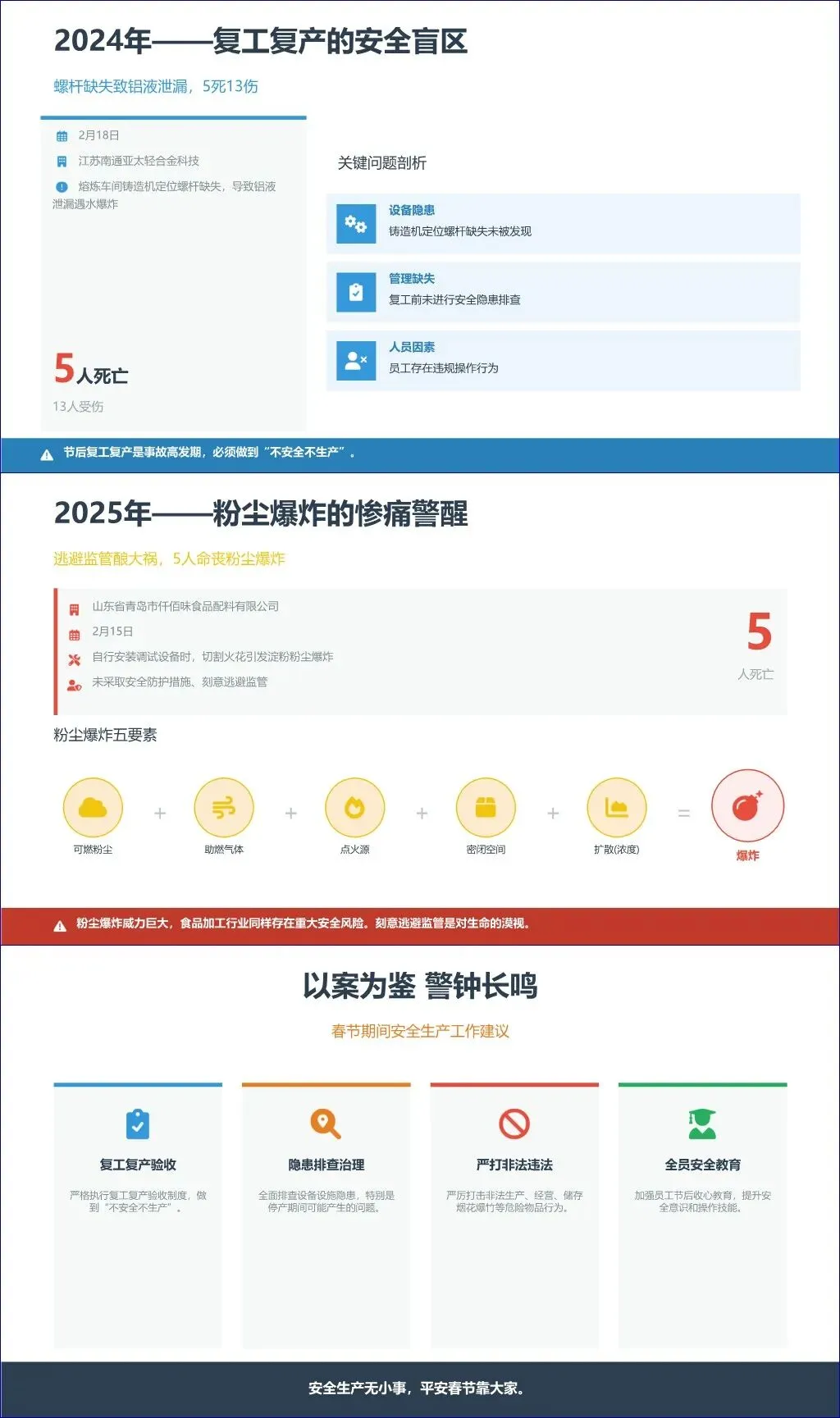 典型案例分析: 回顾了2016年至2025年春节期间发生的15起典型事故,涵盖烟花爆竹非法生产、化工企业复工试车未检测气体、矿山设备故障、建筑施工坍塌、交通超载及粉尘爆炸等。
