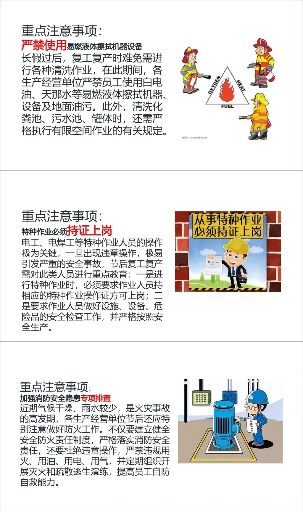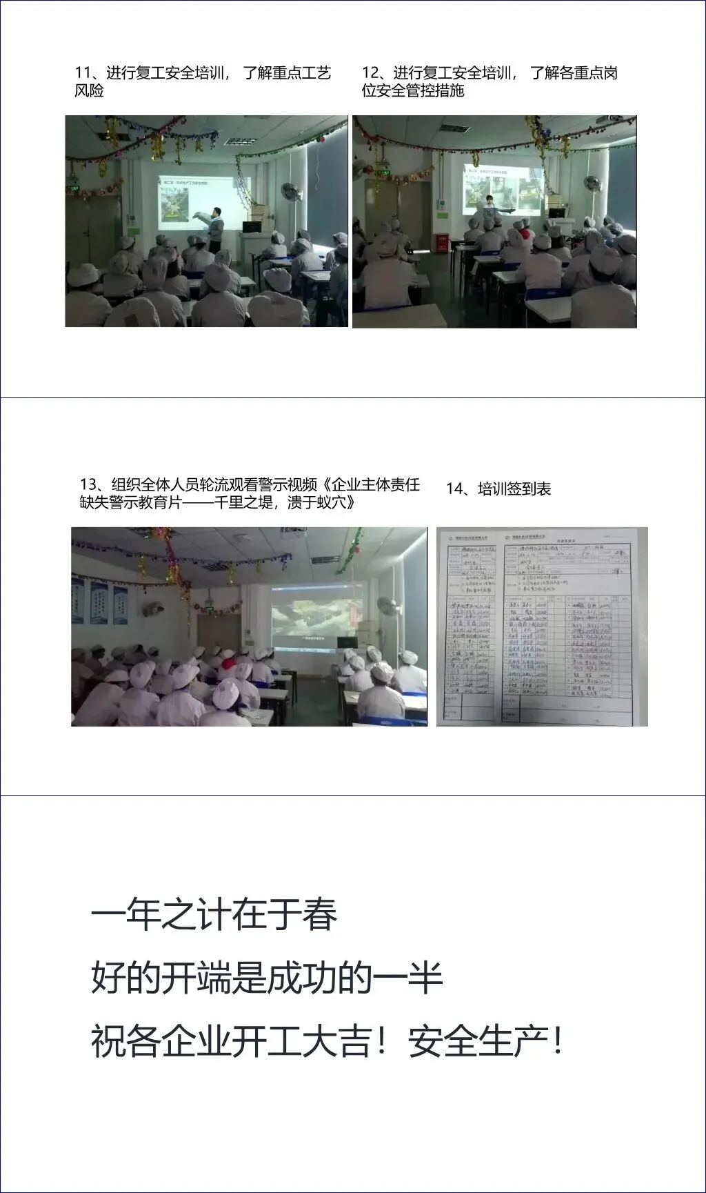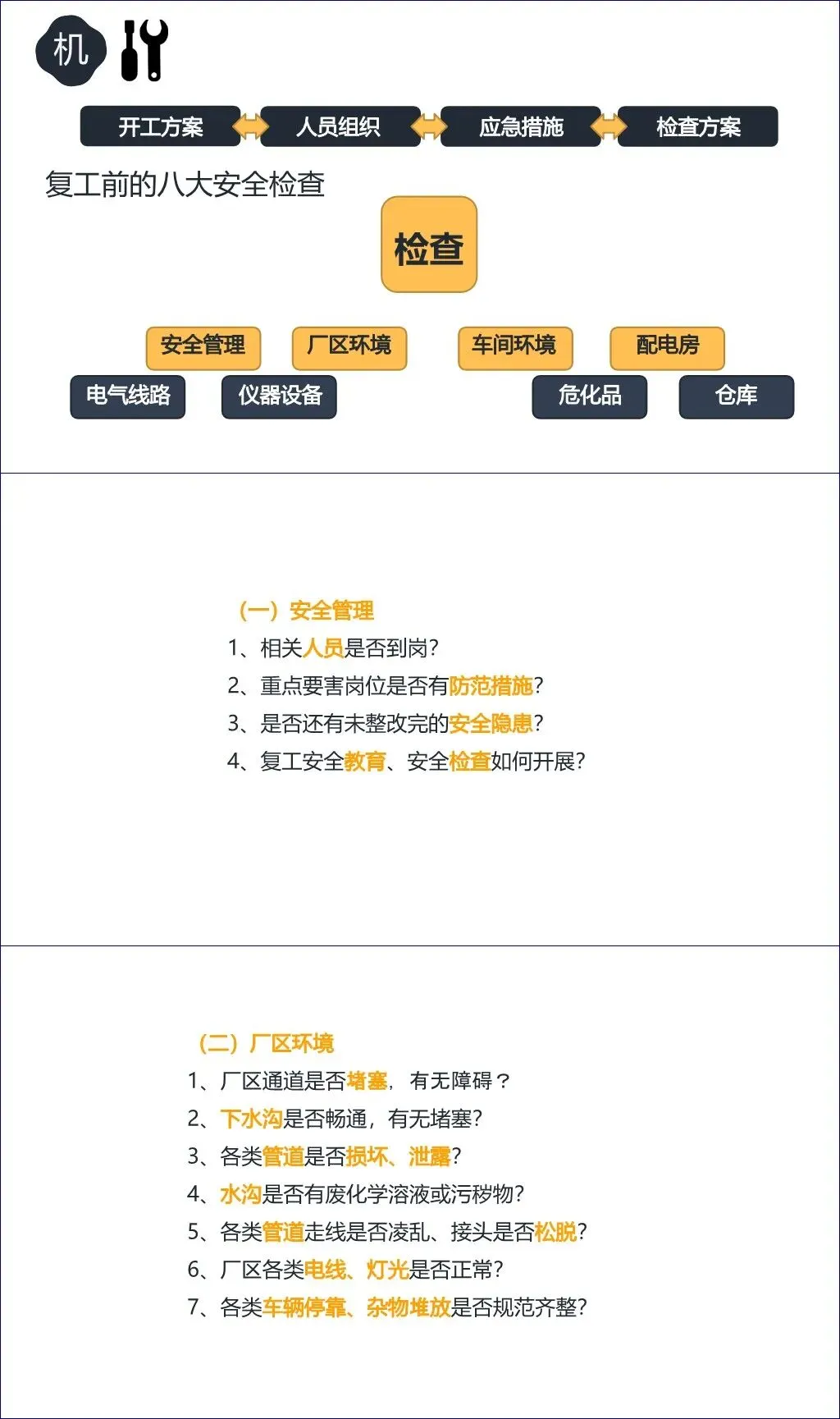 组织一次检查: 坚持“先排查、后复工”原则。重点检查生产设备、电气线路、消防设施、危化品储存等。严禁使用易燃液体擦拭设备,严格执行有限空间作业规范。