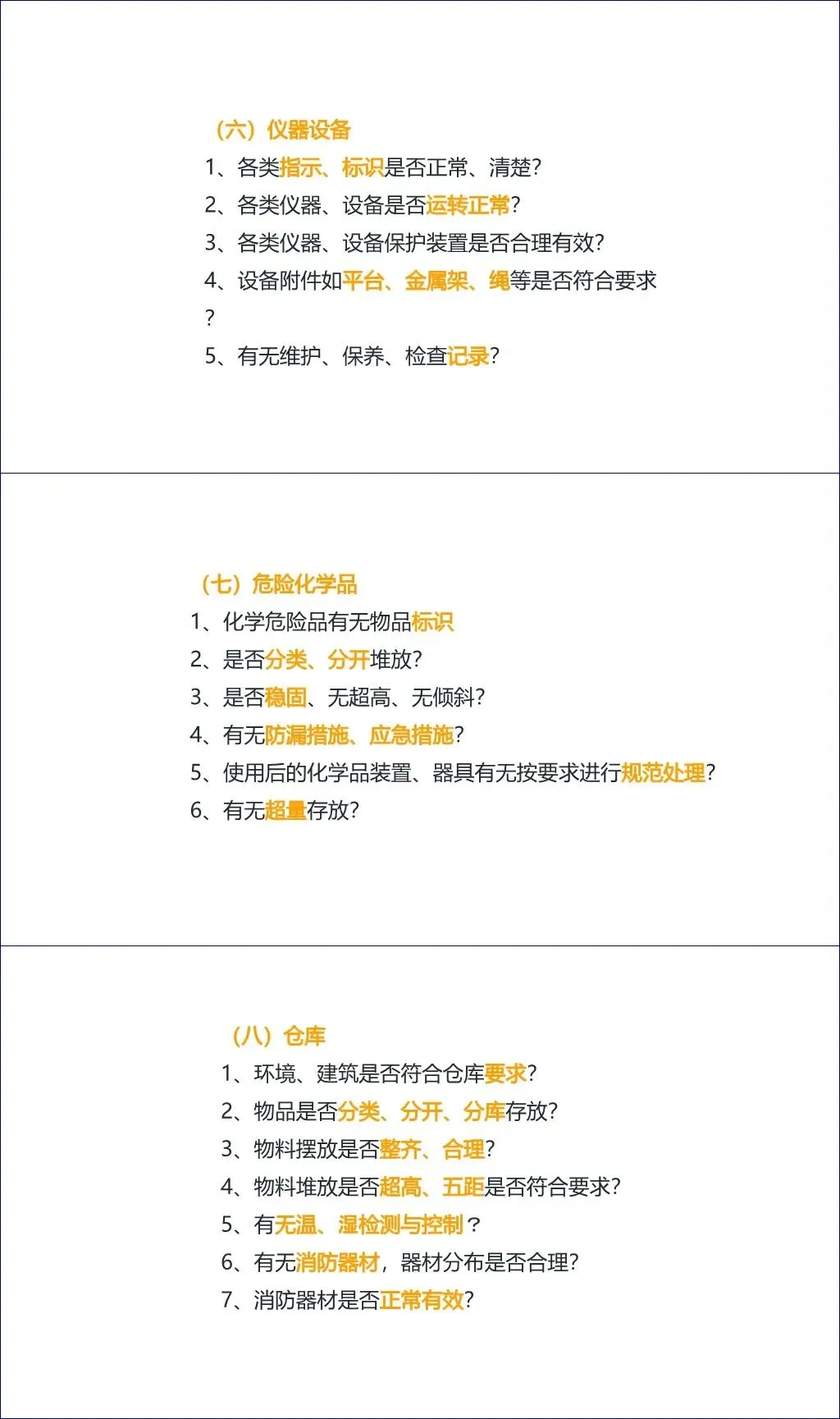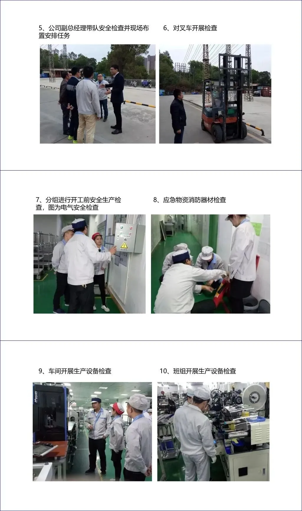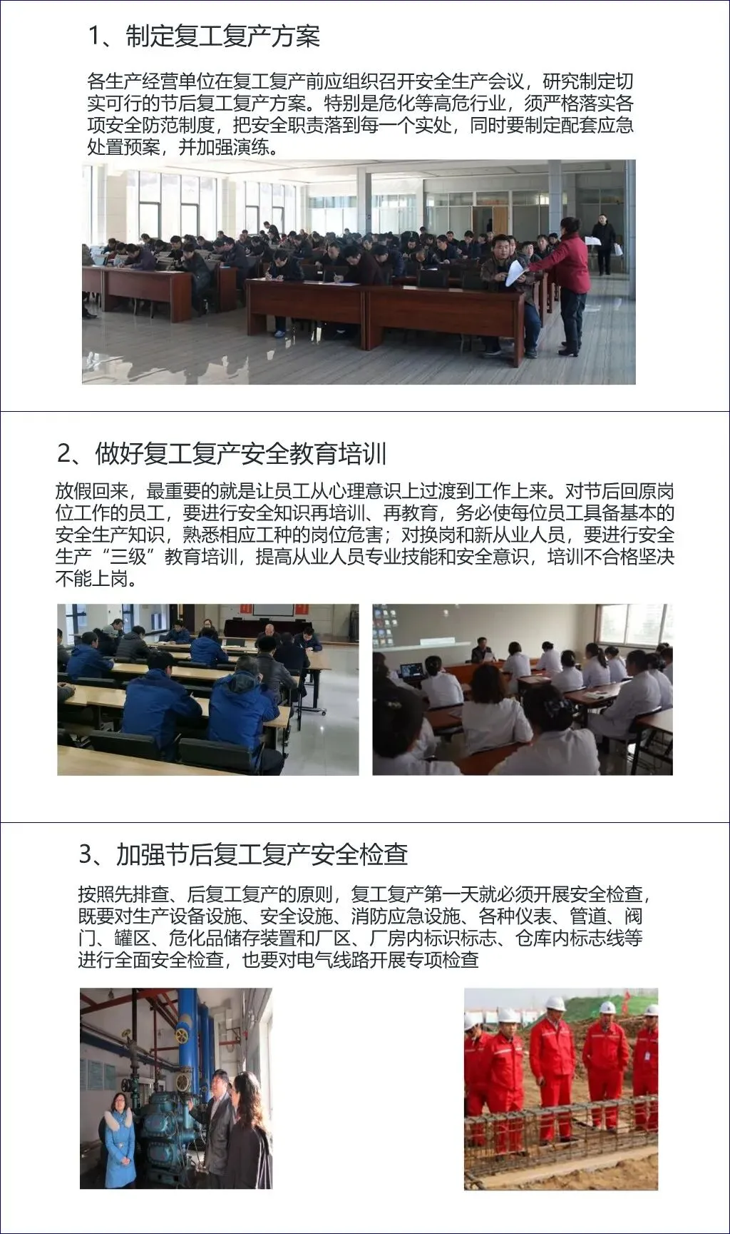 组织一次检查: 坚持“先排查、后复工”原则。重点检查生产设备、电气线路、消防设施、危化品储存等。严禁使用易燃液体擦拭设备,严格执行有限空间作业规范。