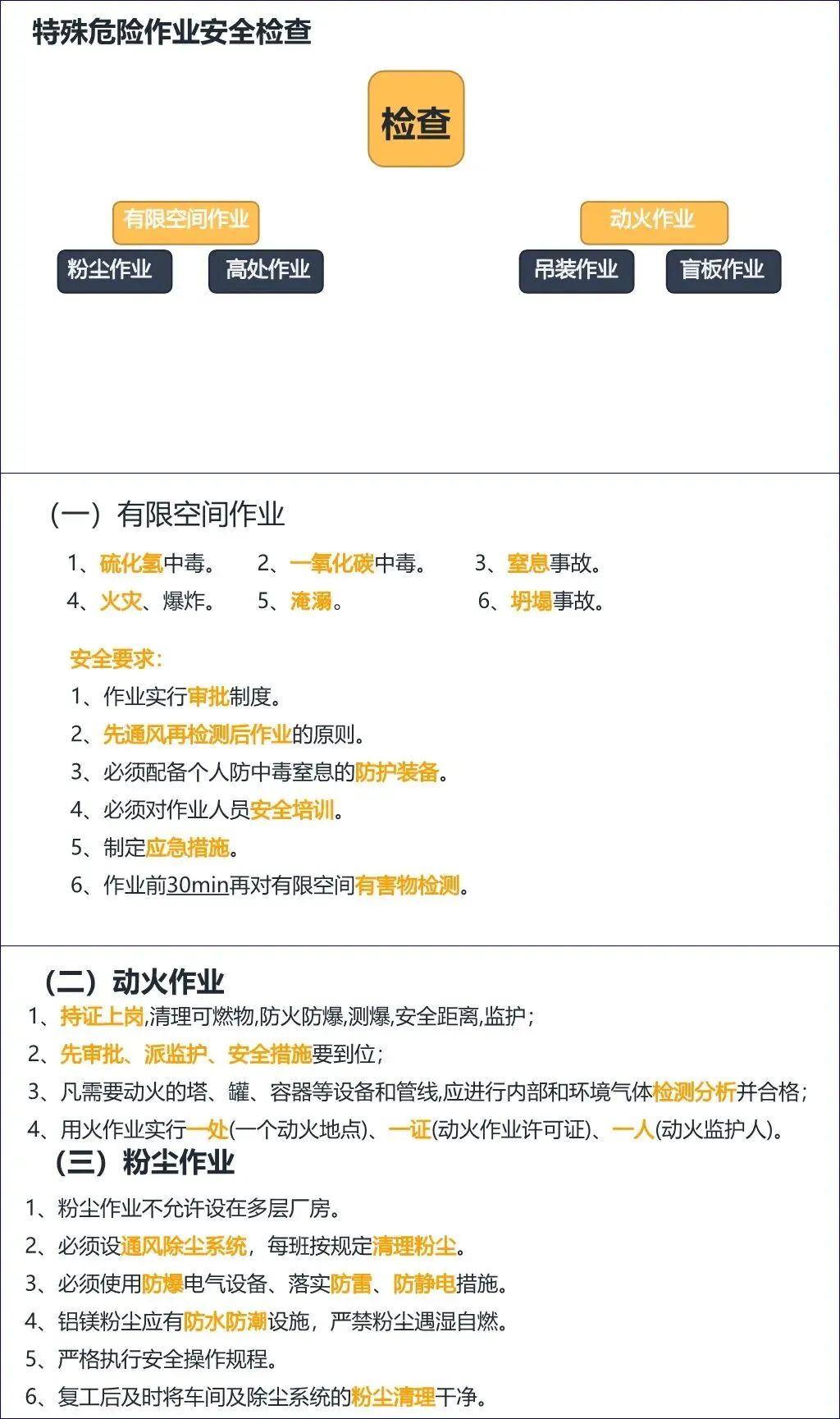 法(Method): 严格执行特殊危险作业审批制度,包括有限空间、动火、粉尘、高处、吊装及盲板作业,落实各项安全技术措施。